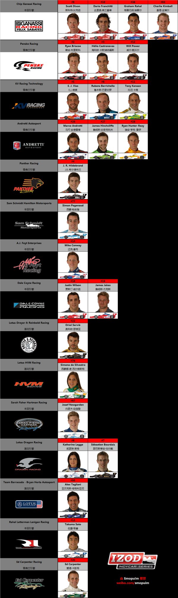 【2012赛季IndyCar系列赛车队车手一览】