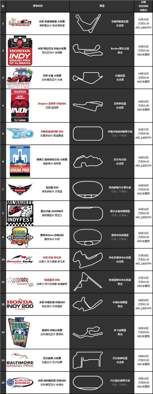 【2012赛季IndyCar系列赛赛程】
