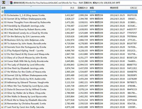 原著:威廉·莎士比亚(William Shakespeare),约翰·济慈(John Keats),拜伦(Lord Byron),阿尔弗雷德·丁尼生(Lord Alfred Tennyson),威尔弗雷德·欧文(Wilfred Owen)等