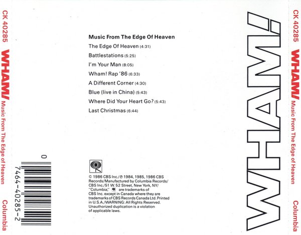 我想这张应该是VC上的稀有资源了,有较大的收藏价值。《last chritmas》就是出于这张大碟。 1986年,WHAM!推出了他们的最后一张专辑《music from the edge of heaven》,George担纲了专辑中所有歌曲的制作及创作大任,出现在专辑里的大部份的乐器,也都由他一手包办。不过,George和Andrew却在乐团尚处于巅峰的彼时宣布解散。两人在1986年6月时于英国伦敦的温布莱体育馆举行告别演唱会,WHAM!也正式走入历史。 《last chritmas》是走红于1985年, 尤其接近耶诞节时更是舞会必播曲,也被收录在wham第三张大碟《music from the edge of heaven》里。WHAM不断推出单曲而且支支动听, 不过创作皆来自于George Michael之手, 目光焦点自然落在他一人身上, 相对另一团员Angrew Ridgeley,就变得悄无声息。熟悉流行音乐的人都知道,其实WHAM虽然是由Geroge Michael及Andrew Ridgeley所组成,但是其实Andrew Ridgeley是不懂得任何乐器的,而WHAM的所有歌都是由George Michael主唱、作曲、编曲及音乐演奏一手包办(除了careless whisper有份作了一半),既然是如此,所以George Michael数年后顺理成章作个人发展,当然也是非常成功。