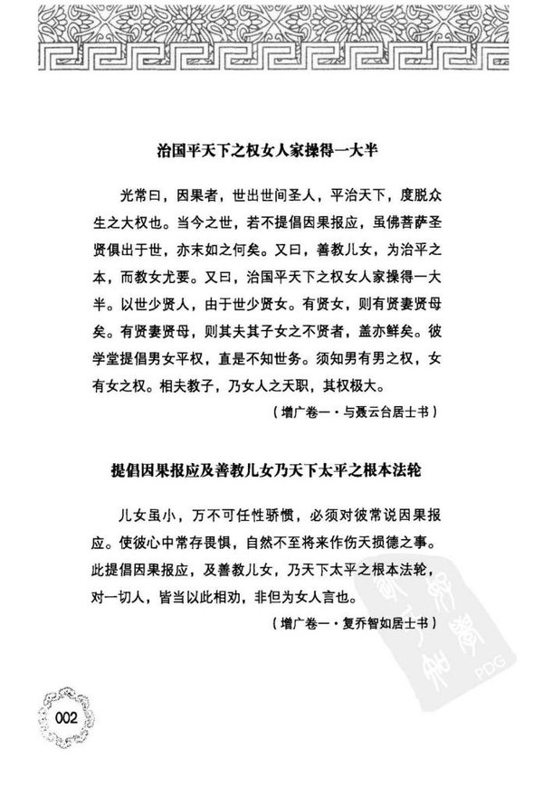 印光大师非常重视家庭教育和因果教育。现代人内有烦恼习气,外有无量无尽的诱惑,怎样确保不为所动、不被诱惑,《印光大师家庭教育嘉言录》针对此一问题,收录了《印光法师文钞》中的相关经典话语,认为家庭教育为治安之本,因果教育为制心之法,家庭教育与因果报应相为辅翼互为经纬。作为父母,须知世间最大的功德,莫过于善教儿女;世间最大的恶业,莫过于不教儿女。善教儿女,则必重因果教育。种善因得善果,造恶业必定得恶报。明白了这个基本道理,儿女自然能敦伦尽分、闲邪存诚,天下太平。