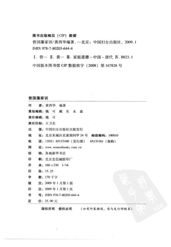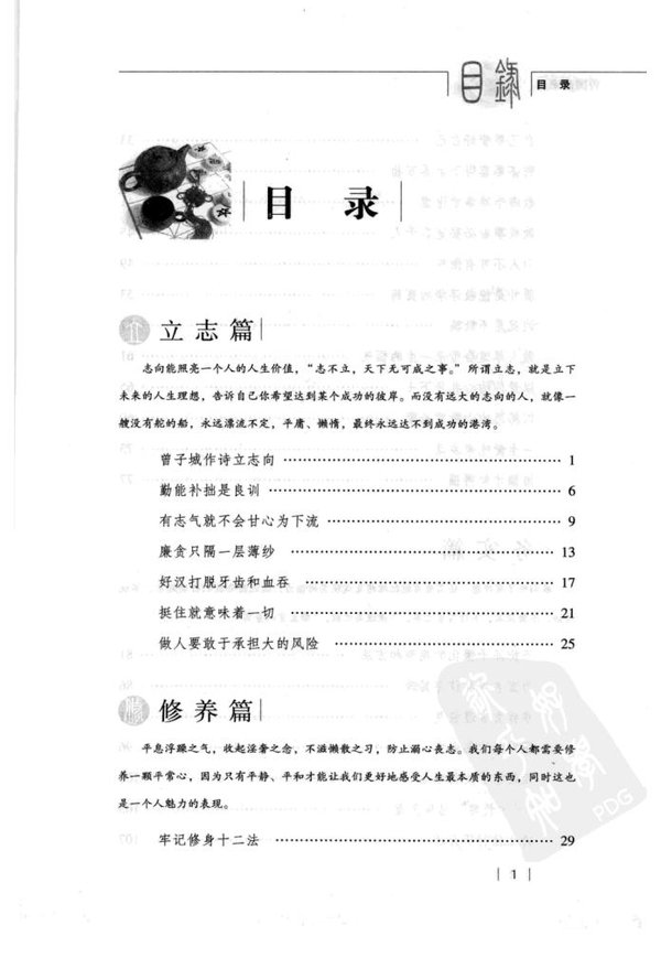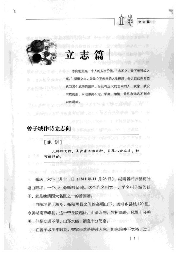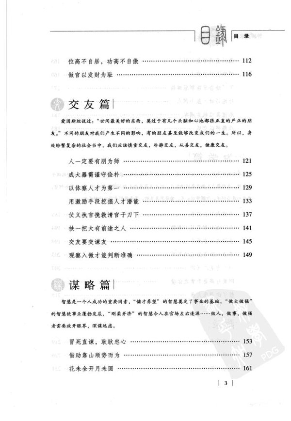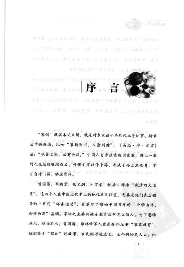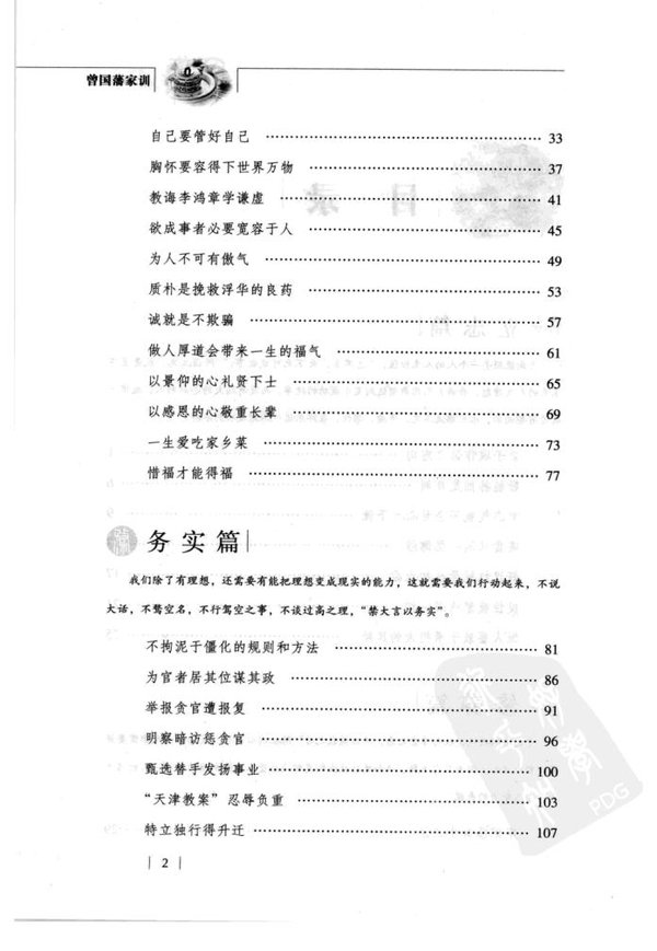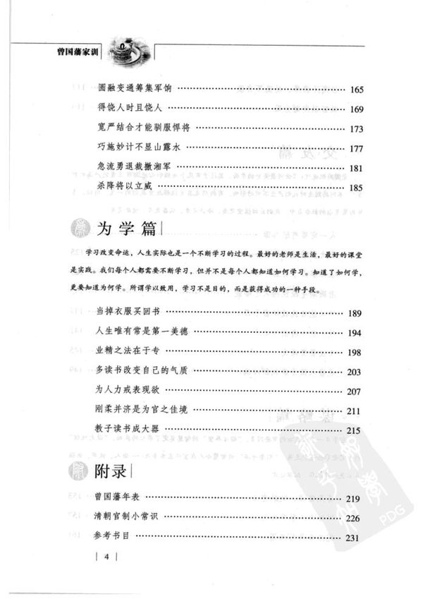 : 曾国藩家训: 立志篇 曾子城作诗立志向 勤能补拙是良训 有志气就不会甘心为下流 廉贪只隔一层薄纱 好汉打脱牙齿和血吞 挺住就意味着一切 做人要敢于承担大的风险 修养篇 牢记修身十二法 自己要管好自己 胸怀要容得下世界万物 教诲李鸿章学谦虚 欲成事者必要宽容于人 为人不可有傲气 质朴是挽救浮华的良药 诚就是不欺骗 做人厚道会带来一生的福气 以景仰的心礼贤下士 以感恩的心敬重长辈 一生爱吃家乡菜 惜福才能得福 务实篇 不拘泥于僵化的规则和方法 为官者居其位谋其政 举报贪官遭报复 明察暗访惩贪官 甄选替手发扬事业 “天津教案”忍辱负重 特立独行得升迁 位高不自居,功高不自傲 做官以发财为耻 交友篇 人一定要有朋为师 成大器需谨守俭朴 以体察人才为第 用激励手段挖掘人才潜能 仗义执言挽救清官于刀下 扶一把大有前途之人 交友要交谏友 观察入微才能判断准确 谋略篇 冒死直谏,耿耿忠心 借助靠山顺势而为 花未全开月未圆 圆融变通筹集军饷 得饶人时且饶人 宽严结合才能驯服悍将 巧施妙计不显山露水 急流勇退裁撤湘军 杀降将以立威 为学篇 当掉衣服买回书 人生唯有常是第一美德 业精之法在于专 多读书改变自己的气质 为人力戒表现欲 刚柔并济是为官之佳境 教子读书成大器 附录 曾国藩年表 清朝官制小常识 参考书目 …… 李鸿章家训 左宗棠家训 张之洞家训