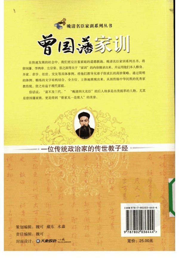 “家训”就其本义来讲,就是对本家族子弟后代立身处事、持家治学的教诲,比如“家勤则兴,人勤则健”。《易经·坤·文言》语:“积善之家,必有余庆。”中国人自古注重庭训家教.将上一辈的人生经验凝缩成文,付诸文字以传子孙,告诫子孙立志修身,不可自恃门第、骄逸怠惰。   曾国藩、李鸿章、张之洞、左宗棠,被后人称为“晚清四大名臣”。这四个人在中国近代史上的地位举足轻重,尤其是他们先后倡导的一系列“洋务运动”,更奠定了影响中国百年的“中学为体,西学为用”基调。家训之主要目的是教育后代怎么做人。为了恩泽族人,积福后人,曾国藩、李鸿章等人更是分外注重“家庭教育”,他们关于“家训”的故事,在民间源远流长,至今仍脍炙人口。