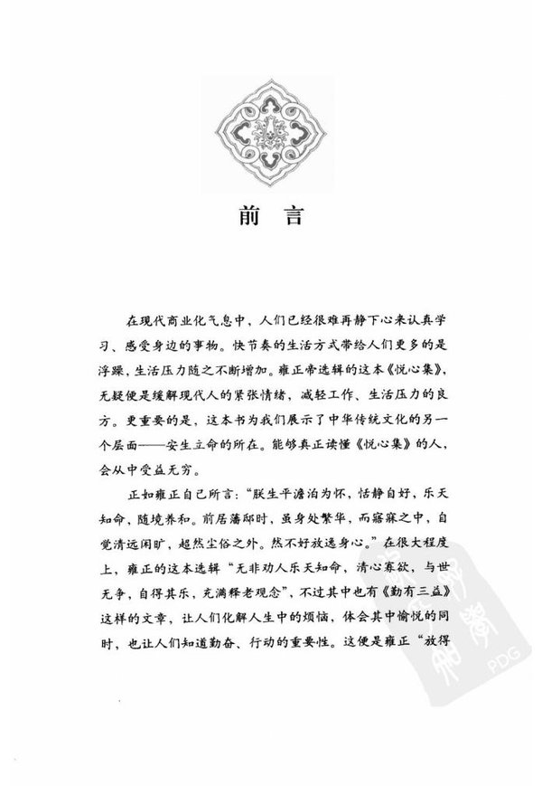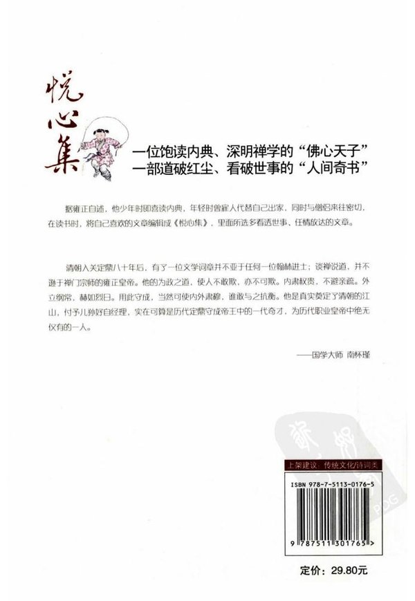 《悦心集》是雍正帝将自己做皇帝前在藩邸读书时抄录的各种人物(官吏、隐士、释道、名士、庶人)所写的短文、诗赋、格言或社会上流传的趣事、谐语、歌诀等汇编而成的南书。粗略统计下,约收入130多位有名姓者(或与之有关)的作品245篇(首、段),另有40多篇作者不详。作者时代为东汉末年至明代。   清朝入关定鼎八十年后,有了位文学词章并不亚于任何一位翰林进士;谈禅说道,并不逊于禅门宗师的雍正皇帝。他的为政之道,使人不敢欺,亦不可欺。内肃权贵,不避亲疏。外立纲常,赫如烈日。用此守成,当然可使内外肃穆,谁敢与之抗衡。他呈真实奠定了清朝的江山,付予儿孙好自经理,实在可算是历代定鼎守成帝王中的一代奇才,为历代职业皇帝中绝无仅有的人。   ——国学大师南怀瑾