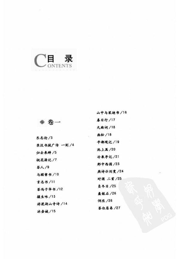 : 卷一 乐志论/5 录汉书疏广传一则/4 归去来辞/5 桃花源记/7 答人/9 与顾章书/10 言志书/11 答冯子华书/12 摄生咪/13 游滗湖山寺诗/14 冰壶诫/15 山中与裴迪书/16 春日行/17 九曲词/18 画松/18 平都观记/19 池上篇/20 冷泉亭记/21 郡中西园/23 燕诗示刘叟/24 对酒二首/25 负冬日/25 盘铭石/26 悯农/26 答白居易/27 陋室铭/28 郊居即事/29 咏走马灯诗/30 寻张逸人山居/30 垂训诗/31 传心偈/32 水中睹影口占/33 六言/34 牧童/34 苏幕遮/35 浪淘沙/35 绝句/36 中秋对月/36 十五夜望月/37 天台山桐柏观序/38 题文川村居/39 答人诗/39 山中僧/40 题岩诗录四首/41 题壁诗录三首/42 法语/43 南山曲/44 小重山/45 春光好/46 锦缠道/47 闲仙/48 答白云之句三首/49 更漏子/50 庭莎记/51 门铭/52 五不欺/53 省心录五则/54 省事吟/55 仁/56 何处是仙乡/56 冬至二首/57 为善吟/58 十分吟/59 乐乐/60 尧夫何所有/60 思山吟/61 推诚吟/61 观易吟/62 安乐窝中自贻/62 仁者吟/63 年老逢春/65 天听吟/64 至诚吟/64 清夜吟/65 身太平/65 安乐窝申/66 四喜/66 太平吟/67 可秘吟/81 安乐吟/68 瓮牖吟/69 无妄吟/70 尧夫饮酒吟/70 招友为真率会/71 酬华严真师/71 乐/72 洛阳耆英会序/73 独乐园记/75 嵩山寺法堂门壁/77 君子贵慎独/77 卷二 谢判官幽谷种花/81 学书为乐/81 归田录一则/82 题临皋亭/83 江郊有序/84 述怀调行香子/85 书黄鲁直李氏传后/86 论诗/87 鉴空阁/88 题西林壁/88 赠东林总长老/89 资福白长老小照赞/89 点绛唇杭州/90 梅竹石赞/90 书兰芳亭/91 书赠韩琼秀才/92 记居钟山/93 黄州竹楼记/94 高斋/96 赏春亭/96 秦州玩芳亭记/97 张无尽见雪窦教以惜福之说二则/98 喜迁莺/99 南溪自咏/100 敬恕斋铭/101 敬斋铭/102 与张伯信书/103 与邵叔谊书/104 与李信仲书/104 论语说/105 本仁说/106 论琴/107 寄陆子静先生/108 咏春/108 纪先训/109 范公泉/110 烟艇记/111 梅花/112 鹊桥仙/113 和豫快适/114 无伪/114 记赵忭逸事/115 论归田赋/116 插秧/117 梅品/118 丰年谣/119 小楼连苑/120 黄河清/121 水调歌头题舫斋/122 苕溪渔隐/123 湖山记/124 柳枝词/126 山居述事/127 方寸地说/129 记王梅溪真西山二诗/131 菜说/132 黄绵袄/133 道不在语言文字/134 勤有三益/135 水调歌头喜雪/136 西山/137 送陈随隐游庐山/137 渔父词二首/138 涧泉自记/119 鹧坞天/140 书张道者屋壁/141 记谦禅师法语/142 禅本草/143 论仁字/144 书《感应篇》后/145 长沙劝耕/146 陈尚书宗召均赡宗族真迹/146 四留铭/147 山间明月楼记/148 卉冈堂记/149 …… 卷三 卷四 卷五