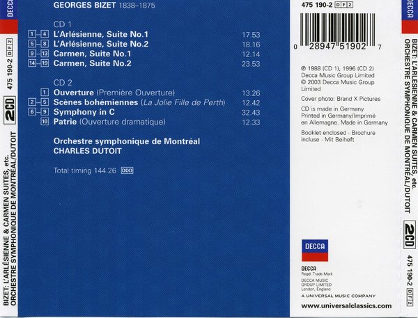 : CD1: 1. L'Arlésienne Suite No.1 - Prélude 2. L'Arlésienne Suite No.1 - Minuetto 3. L'Arlésienne Suite No.1 - Adagietto 4. L'Arlésienne Suite No.1 - Carillon 5. L'Arlésienne Suite No.2 - Pastorale 6. L'Arlésienne Suite No.2 - Intermezzo 7. L'Arlésienne Suite No.2 - Menuet 8. L'Arlésienne Suite No.2 - Farandole 9. Carmen Suite No.1 - Prélude - Aragonaise 10. Carmen Suite No.1 - Intermezzo 11. Carmen Suite No.1 - Séguidille 12. Carmen Suite No.1 - Les dragons d'Alcala 13. Carmen Suite No.1 - Les toréadors 14. Carmen Suite No.2 - Marche des contrebandiers 15. Carmen Suite No.2 - Haba?era 16. Carmen Suite No.2 - Nocturne 17. Carmen Suite No.2 - Chanson du toréador 18. Carmen Suite No.2 - La garde montante 19. Carmen Suite No.2 - Danse bohème CD2: 1. Ouverture (Première Ouverture) 2. La jolie fille de Perth, Suite - 1. Prélude 3. La jolie fille de Perth, Suite - 2. Sérénade 4. La jolie fille de Perth, Suite - 3. Marche 5. La jolie fille de Perth, Suite - 4. Danse bohémienne 6. Symphony in C - 1. Allegro (Allegro vivo) 7. Symphony in C - 2. Andante (Adagio) 8. Symphony in C - 3. Scherzo (Allegro vivace) 9. Symphony in C - 4. Finale (Allegro vivace) 10. Patrie! (Ouverture Dramatique, Op.19)