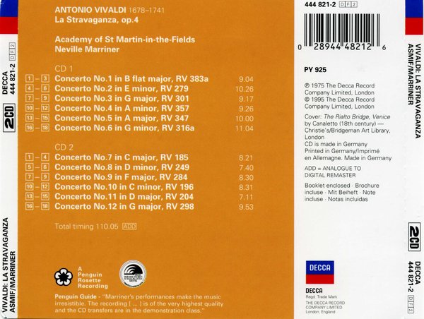 由内维尔?马里纳爵士指挥圣马丁乐团(Academy Of St Martin In The Fields)演奏灌录的《维瓦尔第:异乎寻常》(La Stravaganza),在2009年《企鹅古典唱片指南》中被推荐为四星带花。