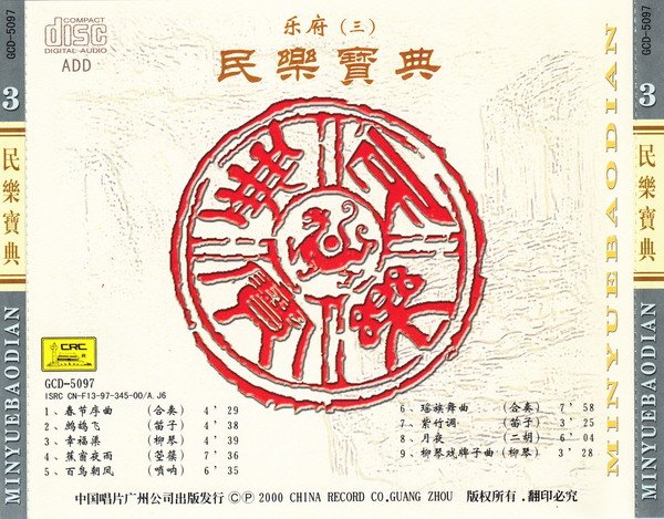 民乐宝典系列,共10CD,是中唱广州1997年出版的民族音乐的名家名曲合集。曲目内容广泛,既有传统民间乐曲,也有古典名曲,更有最新近创作民乐曲,演绎录音不错,堪称民族音乐收藏佳品。这是第三集,收录了《春节序曲》、《鹧鸪飞》、《瑶族舞曲》等民乐名曲。