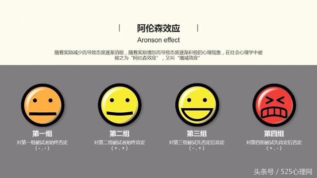 随着奖励减少而导致态度逐渐消极,随着奖励增加而导致态度逐渐积极的心理现象,被称之为“阿伦森效应”。