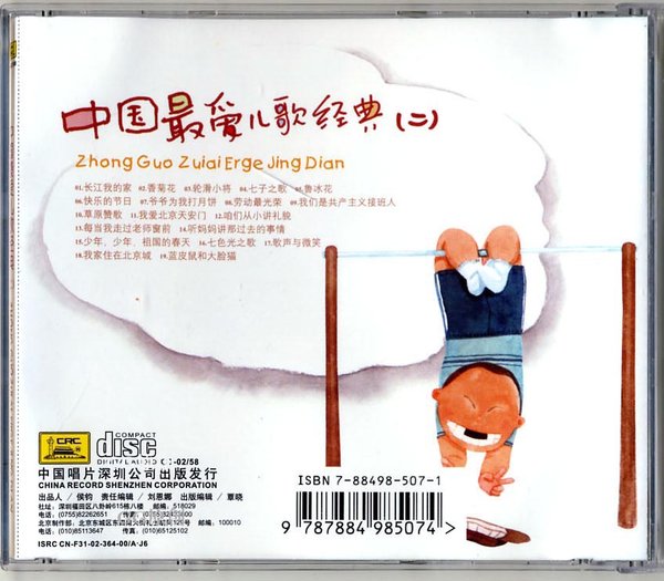 : 01. 长江我的家 (广播少年合唱团) [0:03:29.38] 02. 香菊花 (金晶晶) [0:04:03.29] 03. 轮滑小将 (李彦龙) [0:03:25.56] 04. 七子之歌 (容韵琳) [0:02:17.29] 05. 鲁冰花( 甄妮) [0:03:56.61] 06. 快乐的节日 (新月合唱团) [0:02:18.15] 07. 爷爷为我打月饼 (章中锦) [0:01:33.59] 08. 劳动最光荣 (中广少年广播合唱团) [0:01:29.60] 09. 我们是共产主义接班人 (新月合唱团) [0:02:03.03] 10. 草原赞歌 (新月合唱团) [0:02:27.36] 11. 我爱北京天安门 (金月苓) [0:02:01.37] 12. 咱们从小讲礼貌 (北京少年宫合唱团) [0:01:31.09] 13. 每当我走过老师窗前 (中广少年广播合唱团) [0:02:39.26] 14. 听妈妈讲那过去的故事 (吉庆莲) [0:04:18.73] 15. 少年少年祖国的春天 (新月合唱团) [0:02:10.44] 16. 七色光之歌 (新月合唱团) [0:02:06.63] 17. 歌声与微笑 (新月合唱团) [0:02:36.49] 18. 我家住在北京城 (杨威、苑青、庄怀玢) [0:02:43.69] 19. 蓝皮鼠和大脸猫 (章中锦) [0:01:33.12]