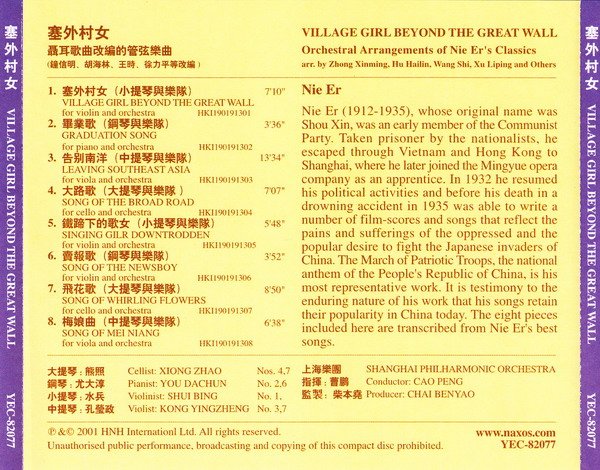 : 01. 塞外村女 (小提琴与乐队) Village Firl Beyond The Great Wall [0:07:16.03] 02. 毕业歌 (钢琴与乐队) Graduation Song [0:03:42.42] 03. 告别南洋 (中提琴与乐队) Leaving Southeast Asia [0:13:39.58] 04. 大路歌 (大提琴与乐队) Song Of The Broad Road [0:07:13.32] 05. 铁蹄下的歌女 (小提琴与乐队) Singing Girl Downtrodden [0:05:53.65] 06. 卖报歌 (钢琴与乐队) Song Of The Newsboy [0:04:00.48] 07. 飞花歌 (大提琴与乐队) Song Of Whirling Flowers [0:09:00.07] 08. 梅娘曲 (中提琴与乐队) Wong Of Mei Niang [0:06:43.03]