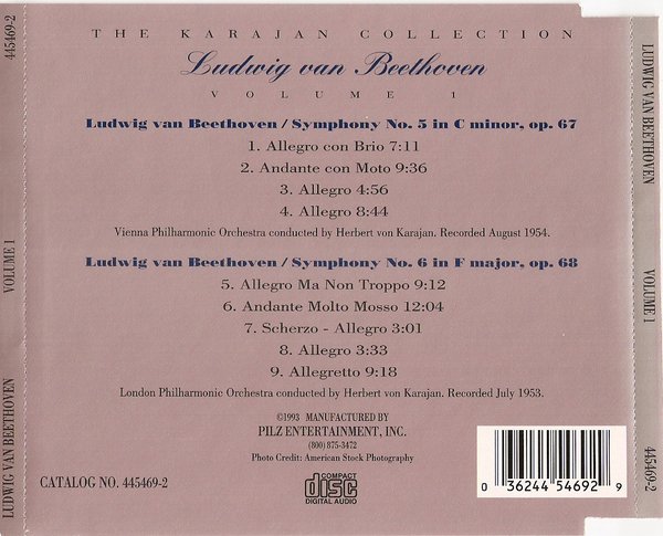 CD是PILZ公司1993年出版的,简装版,封面和底封都是单片纸张单面印刷,没有Booklet,也没有更多文字解说。由于是1953/54年的录音,声音听上去很有历史沧桑感:)但是,卡拉扬与维也纳爱乐以及伦敦爱乐的搭配和演绎的确是没什么说的!这家公司的东西我很少见到过,这个系列的其它几张CD我也一直没有碰到过。有了解这些信息的朋友请不吝赐教!