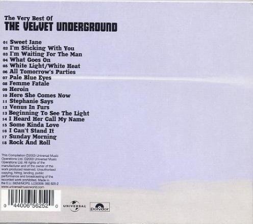 这张是velvet underground 的2003年的精选集,velvet underground 是由 Lou Reed,John Cale,Sterling Morrison和Maureen Tucker 以及 Nico 在60年代组成的乐团,1970年解散。 简历:  “Life Was Saved By Rock & Roll”这句由Lou Reed的“Rock & Roll”中所唱出的名言,至今让人确信不已。   听过Velvet Underground(以下简称V.U.)的人,总会迷失在那简单的4/4小节,3、4个和弦即可完成的作品。但是在粗糙的White-Noise、呢喃自虐式的演唱以及波谱艺术大师Andy Warhol的华丽包装下,使V.U.在当时的乐队中的确与众不同。   John Cale在纽约结识Lou Reed,Cale是古典理论作曲家及小提琴手,而Reed是古典钢琴手(在V.U. & Nico中的Sunday Morning就是二人坐在钢琴前Jam出来的),后来加入了Stering Morrison(Guitar,Bass,因患淋巴癌病逝于纽约),Angus Naclise (Drums),后来鼓手更替为Maureen Tucker.   1966年,他们在Cafe Bizarre驻唱时认识了Andy Warhol,这位以享乐主义为目标的波谱艺术大师,他肯定商业文明所带给人们的便利与舒适,强调艺术不应以曲高和寡为晃子,而将之商业化,使更多的人能欣赏到艺术的华丽与美妙。他不认为如此会贬低艺术的价值,这些观念不但影响了V.U.,也影响了Lou Reed。   同时他也引荐Nico,使这位美丽的德国模特能表现她另一面的才华;第一张专辑The Velvet Underground & Nico在1966年完成,也成为地下乐队的经典,其中的歌词也反应出当时社会的脱节与失序及对社会的疏离感(由“Sunday Morning”、“ Run Run Run”中可看出端倪),对药物滥用(“Heroin”、“Waiting For The Man”)、享乐主义的(“Venus In Furs”)、性泛滥(“Femme Fatal”)及Lou Reed对Nico的爱慕所作的“I'll Be Your Mirror”)。这些歌词不但反应了当时的社会,也隐约可看出Andy Warhol的思想潜伏于V.U.的歌词中。   Andy Warhol 曾说V.U.将会比Beatles更有成就。照目前看来也不算过分,受V.U.影响的乐队不计其数,像Sonic Youth、David Bowie、Patti Smith、Jesus And Mary Chain.....以及无数个Punk、Post Punk乐队。在这流行的社会里,每个人都有机会流行15分钟。这句Warhol的名言在现今的演艺圈偶像歌手林立,在讲求包装的宝岛,Andy Warhol的话似乎有极高的可信度。 他们的第一张专辑 (1967) 在《滚石》杂志评点的“史上最佳500专辑”中获得13的高位 乐队专辑。