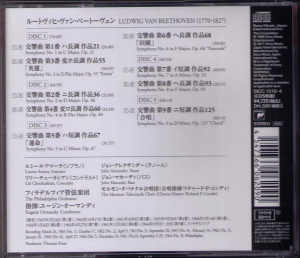 : CD 1 1 Sinfonie Nr. 1 in C-Dur, Op. 21 - I. Adagio molto, Allegro con brio 2 Sinfonie Nr. 1 in C-Dur, Op. 21 - II. Andante cantabile con moto 3 Sinfonie Nr. 1 in C-Dur, Op. 21 - III. Menuetto - Allegro molto e vivace 4 Sinfonie Nr. 1 in C-Dur, Op. 21 - IV. Finale - Adagio, Allegro molto e vivace 5 Sinfonie Nr. 3 in Es-Dur, Op. 55 - I. Allegro con brio 6 Sinfonie Nr. 3 in Es-Dur, Op. 55 - II. Marcia funebre - Adagio assai 7 Sinfonie Nr. 3 in Es-Dur, Op. 55 - III. Scherzo - Allegro vivace - Trio 8 Sinfonie Nr. 3 in Es-Dur, Op. 55 - IV. Finale - Allegro molto, Poco andante CD 2 1 Sinfonie Nr. 2 in D-Dur, Op. 36 - I. Adagio molto, Allegro con brio 2 Sinfonie Nr. 2 in D-Dur, Op. 36 - II. Larghetto 3 Sinfonie Nr. 2 in D-Dur, Op. 36 - III. Scherzo - Allegro 4 Sinfonie Nr. 2 in D-Dur, Op. 36 - IV. Allegro molto 5 Sinfonie Nr. 4 in B-Dur, Op. 60 - I. Adagio, Allegro vivace 6 Sinfonie Nr. 4 in B-Dur, Op. 60 - II. Adagio 7 Sinfonie Nr. 4 in B-Dur, Op. 60 - III. Allegro vivace 8 Sinfonie Nr. 4 in B-Dur, Op. 60 - IV. Allegro ma non troppo CD 3 1 Sinfonie Nr. 5 in c-Moll, Op. 67 - I. Allegro con brio 2 Sinfonie Nr. 5 in c-Moll, Op. 67 - II. Andante con moto 3 Sinfonie Nr. 5 in c-Moll, Op. 67 - III. Scherzo - Allegro 4 Sinfonie Nr. 5 in c-Moll, Op. 67 - IV. Allegro 5 Sinfonie Nr. 6 in F-Dur 'Pastorale', Op. 68 - I. Allegro ma non troppo 6 Sinfonie Nr. 6 in F-Dur 'Pastorale', Op. 68 - II. Andante molto moto 7 Sinfonie Nr. 6 in F-Dur 'Pastorale', Op. 68 - III. Allegro 8 Sinfonie Nr. 6 in F-Dur 'Pastorale', Op. 68 - IV. Allegro 9 Sinfonie Nr. 6 in F-Dur 'Pastorale', Op. 68 - V. Allegretto CD 4 1 Sinfonie Nr. 7 in A-Dur, Op. 92 - I. Poco sostenuto, Vivace 2 Sinfonie Nr. 7 in A-Dur, Op. 92 - II. Allegretto 3 Sinfonie Nr. 7 in A-Dur, Op. 92 - III. Presto 4 Sinfonie Nr. 7 in A-Dur, Op. 92 - IV. Allegro con brio 5 Sinfonie Nr. 8 in F-Dur, Op. 93 - I. Allegro vivace e con brio 6 Sinfonie Nr. 8 in F-Dur, Op. 93 - II. Allegretto scherzando 7 Sinfonie Nr. 8 in F-Dur, Op. 93 - III. Tempo di Menuetto 8 Sinfonie Nr. 8 in F-Dur, Op. 93 - IV. Allegro vivace CD 5 1 Sinfonie Nr. 9 in d-Moll, Op. 125 - I. Allegro ma non troppo, un poco maestoso 2 Sinfonie Nr. 9 in d-Moll, Op. 125 - II. Molto vivace, Presto, Molto vivace 3 Sinfonie Nr. 9 in d-Moll, Op. 125 - III. Adagio molto e cantabile, Andante moderato 4 Sinfonie Nr. 9 in d-Moll, Op. 125 - IV. Presto, Allegro assai - Schlusschor uber Schillers 'Ode an die Freude'