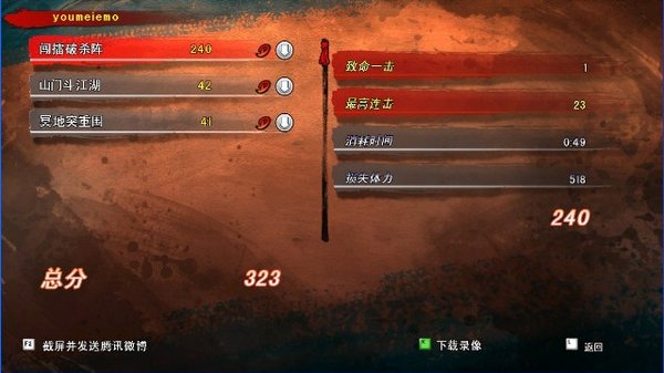 游戏名称:风卷残云:江湖传奇 英文名称:HurricaneX: Jiang Hu Chuan Qi 游戏类型:动作格斗(ACT+FTG)类游戏 游戏制作:秋千软件(Qooc Soft) 游戏发行:百游/7sixty 游戏平台:PC 发售时间:2012年6月27日 官方网站:http://fj.baiyou100.com/ 游戏介绍 【公告】关于资料片“江湖传奇”更新内容说明 发布日期:06/27 “江湖传奇”作为《风卷残云》的首部资料片,正式开放“全国在线排行榜”系统,玩家可通过“江湖传奇”模式挑战各种关卡,竞逐全国排行榜。同时,玩家们还可通过新增的录像及回放功能上传、下载、播放自己及其它玩家的游戏录像进行切磋、学习。 本次“江湖传奇”资料片不仅开放了新的游戏模式,还增加了部分游戏内容,并修复了一些游戏中比较常见的BUG。 《风卷残云》资料片专题页:http://fj.baiyou100.com/5405000.asp “江湖传奇”资料片更新内容: 1、开启“江湖传奇”模式; 2、新增游戏录像与回放功能; 3、适当下调了部分关卡的难度; 4、增加了一个新的场景和挑战关“雄关城墙战”; 5、修正了没有声卡不能进入游戏的问题 6、修正了在部分显卡上界面花屏问题 关于江湖传奇模式下的一些说明和介绍: 1、进入江湖传奇模式前,请确保在登陆界面中“打开”了“联网发送错误报告”选项,如果没有开启就只能体验普通模式,而不能进入江湖传奇模式; 2、登录江湖传奇模式前需要在登录界面中登录百游“一号通”账号。每一个帐号只能绑定一个游戏,不支持多帐号登录; 3、经过首日测试反馈,江湖传奇中的“铁血丹心”和“义胆豪情”两个模式将自6月28日起,每天只能尝试挑战一次; 4、江湖传奇的排行榜在玩家上传分数后,每隔一段时间才会刷新一次。如果上传后没有看到自己的分数,请隔段时间刷新排行榜; 5、在排行榜中有一键举报功能,所有举报信息每天都会进行确认检查,并清除排行榜上的作弊信息; 6、玩家可以通过排行榜下载并观看其他玩家的游戏过程,视频文件将被保存在游戏目录下。玩家也可以通过移动存储设备来交流这些视频; 7、江湖传奇过关后的分数如果没有超过排行榜上您的最高得分,视频将不会保留并上传。如果需要保留视频,请在每关结束后选择“保存视频” 《风卷残云》简体中文数字版官方下载:http://fj.baiyou100.com/5402000.asp 《风卷残云》官方商城购买:http://shop.baiyou100.com/2204000.asp 《风卷残云》销售网点查询:http://fj.baiyou100.com/5403000.asp?mlid=4594 《风卷残云》全版本介绍专题:http://fj.baiyou100.com/fj/zhuanti/bbjs/index.html 《风卷残云》试玩版免费下载体验:http://update1.baiyou100.com/resource/fjcyswb.rar 关于风卷残云: 《风卷残云》是一款3D单机动作游戏,以硬派武侠风格为基调、水墨风格为主要特效渲染方式,让玩家轻松驾驭流畅多变的功夫技巧,勇闯重重难关。 游戏讲述的是一位被流放边疆的王子–罗劲,由于国家的连年战事,被封为将军并召回故土帮助平定纷争。罗劲因此卷入了一连串的事件中,面对祖国、荣誉、个人情仇,罗劲将要如何应对命运的种种挑战? 有关《风卷残云》的消息请关注: 《风卷残云》官方网站:http://fj.baiyou100.com/ 《风卷残云》官方论坛:http://bbs.baiyou100.com/showforum-433.aspx 《风卷残云》研发论坛:http://www.qoocsoft.com/forum/forum.php 《风卷残云》官方新浪微博:http://weibo.com/qoocsoft 《风卷残云》官方腾讯微博:http://t.qq.com/fjcybaiyou100 配置需求 硬件需求   最低配置:   CPU:奔腾4 1.8Ghz 或AMD 同等性能芯片   内存:512M   显卡:Nvidia 6600 或ATI X80 或其他品牌相同配置或以上   推荐配置:   CPU:Intel Core 2 Duo E7400 或者AMD Phenom X3 8750   内存:1G   显卡:Nvidia GeForce 9600GT 512M 或者ATI Radeon HD 3850 512M 软件需求     操作系统:   Windows XP sp2 及以上   Windows 7 及以上 安装信息 1、解压缩 2、复制OfflineUpgradePack105.exe到游戏目录双击运行安装即可 游戏截图