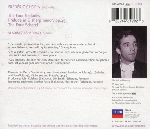 : 1. Ballade No. 1 In G Minor, Op. 23 2. Ballade No. 2 In F Major, Op. 38 3. Ballade No. 3 In A-Flat Major, Op. 47 4. Ballade No. 4 In F Minor, Op. 52 5. Prélude No.25 In C Sharp Minor, Op.45 6. Scherzo No.1 In B Minor, Op.20 7. Scherzo No.2 In B Flat Minor, Op.31 8. Scherzo No.3 In C Sharp Minor, Op.39 9. Scherzo No.4 In E, Op.54