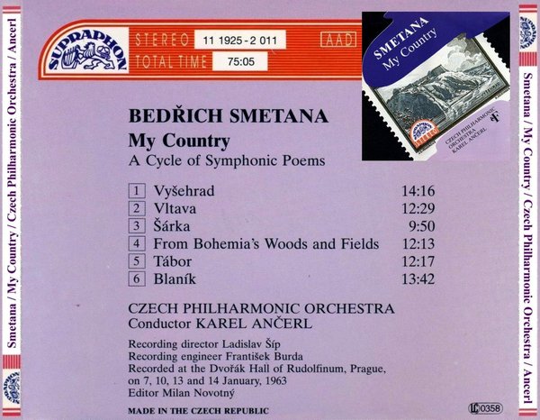 捷克指挥大师卡雷尔.安切尔共留下过4次ma vlast的完整录音。这次的发布是他最著名的一次,1963年与亲兵捷克爱乐录制于其大本营德沃夏克大厅。