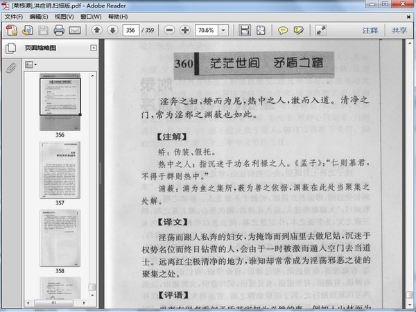 《菜根谭》文辞优美,对仗工整,含义深邃,耐人寻味。是一部有益于人们陶冶情操、磨炼意志、奋发向上的通俗读物。