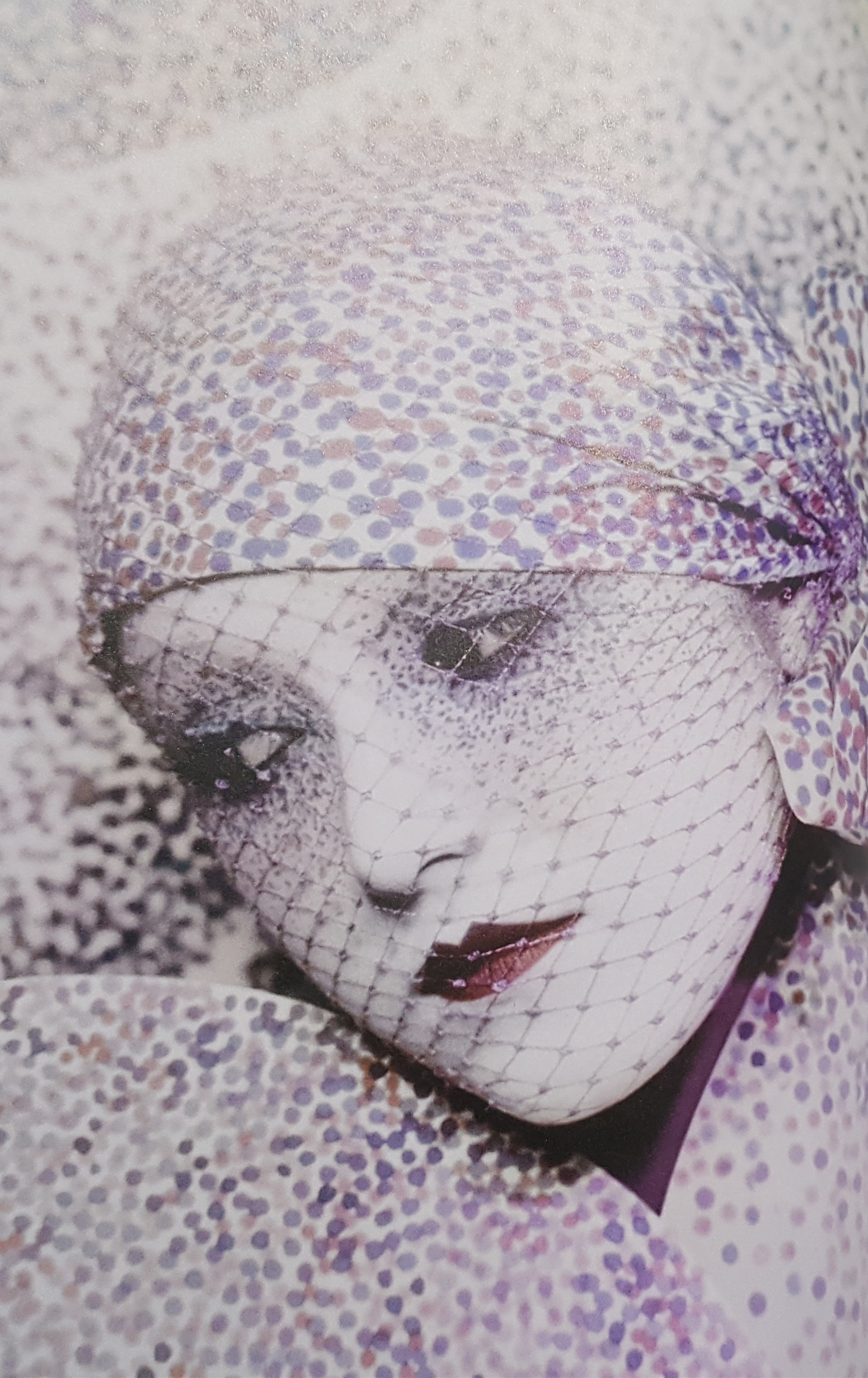 这个Dior妆容,继承了修拉的点彩精髓,这一红一蓝的点组合把光和色进行了分解,在红的点上平行地涂上蓝的点,站在一定距离看上去,画面的两种色彩恰好混合成紫色。