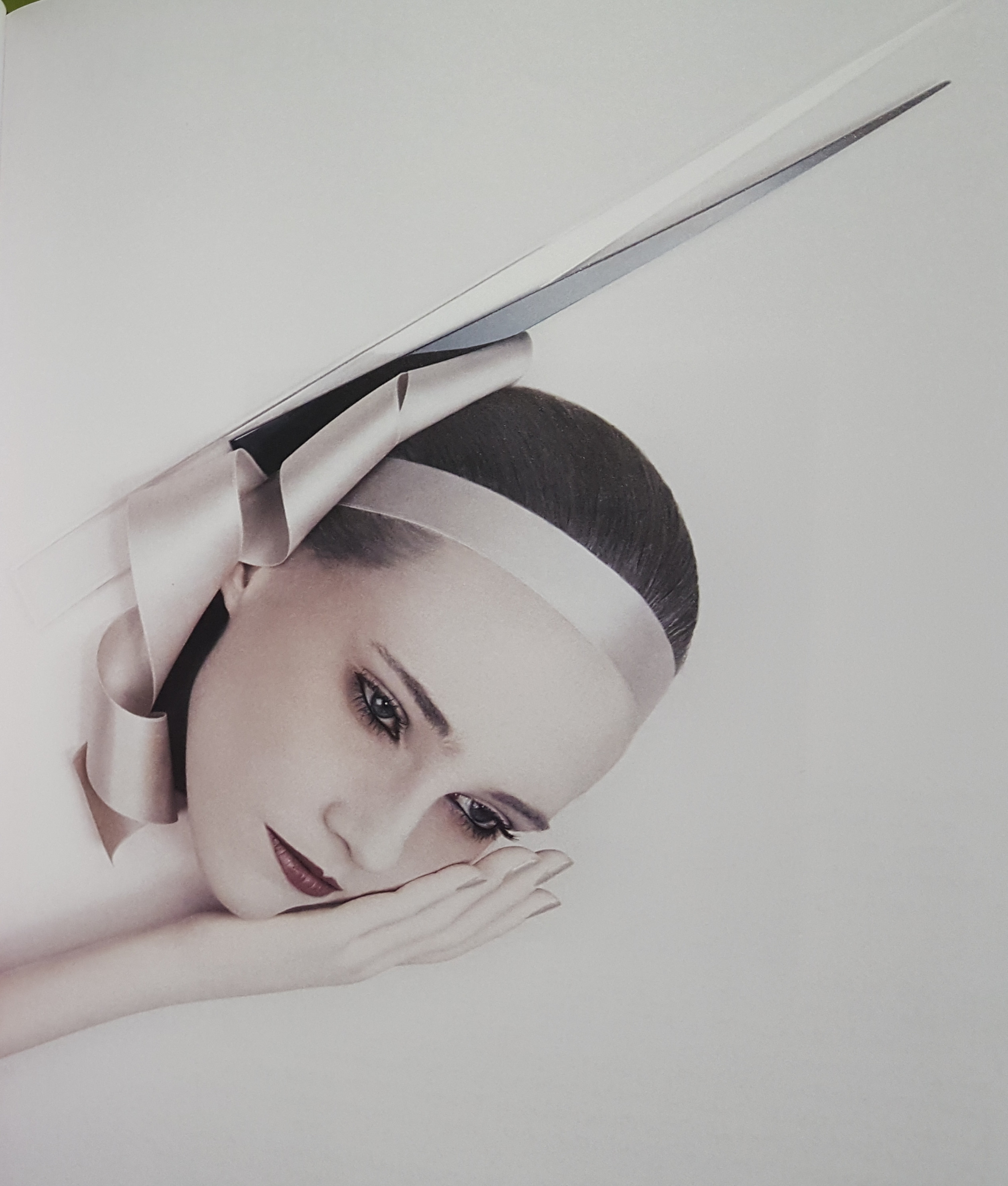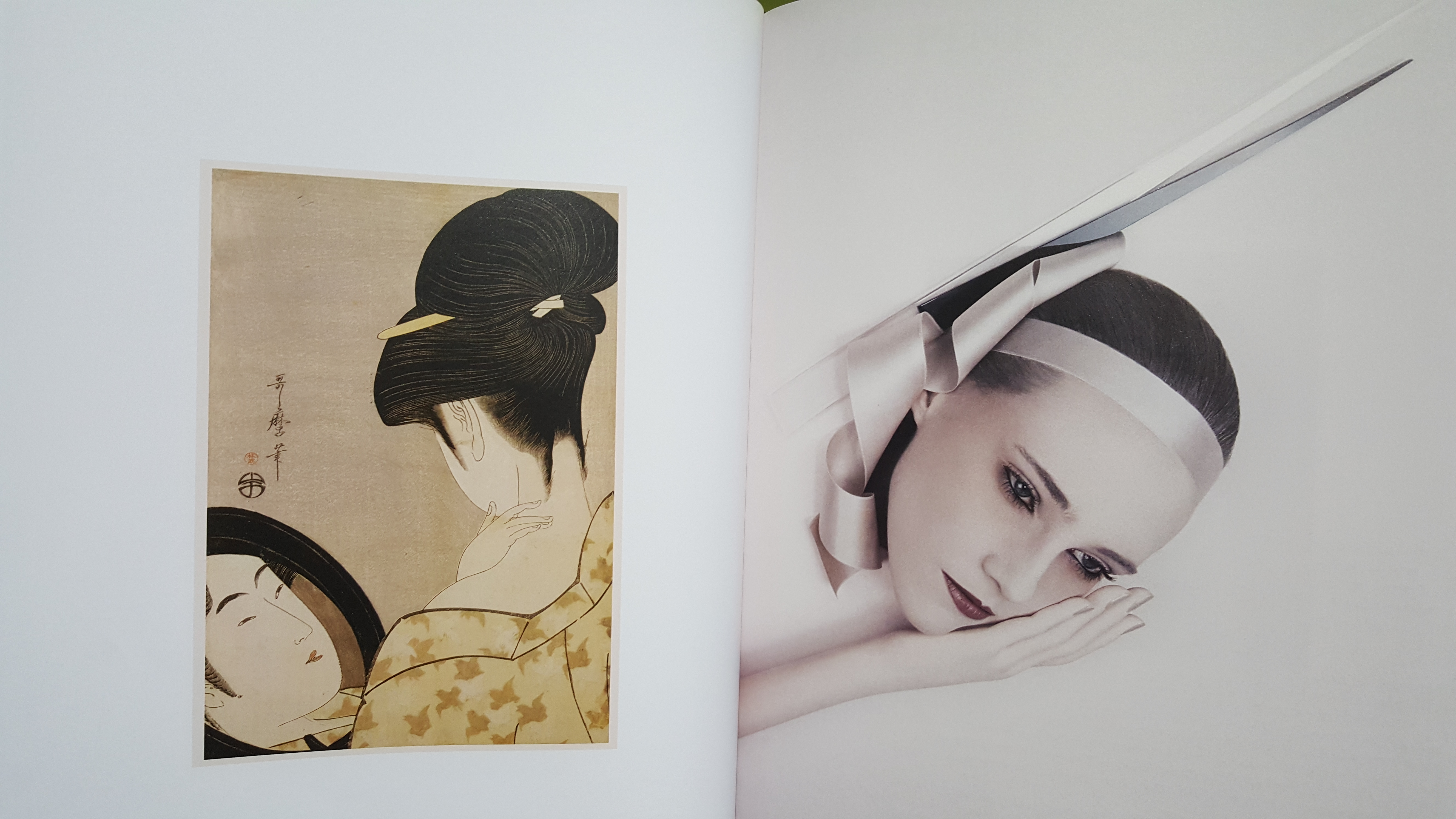 这套妆容,向浮世绘的美人图做了借鉴:人物妆容细腻,色彩结构极为简练,省略了间色繁复的涂抹,以单纯平坦的干净妆面渲染理想美人的表情、姿态与时代感,突出了眉毛、嘴唇几个部位的色彩。在行云流水般的色彩间将理想化的性感女性形象表现得尽善尽美。