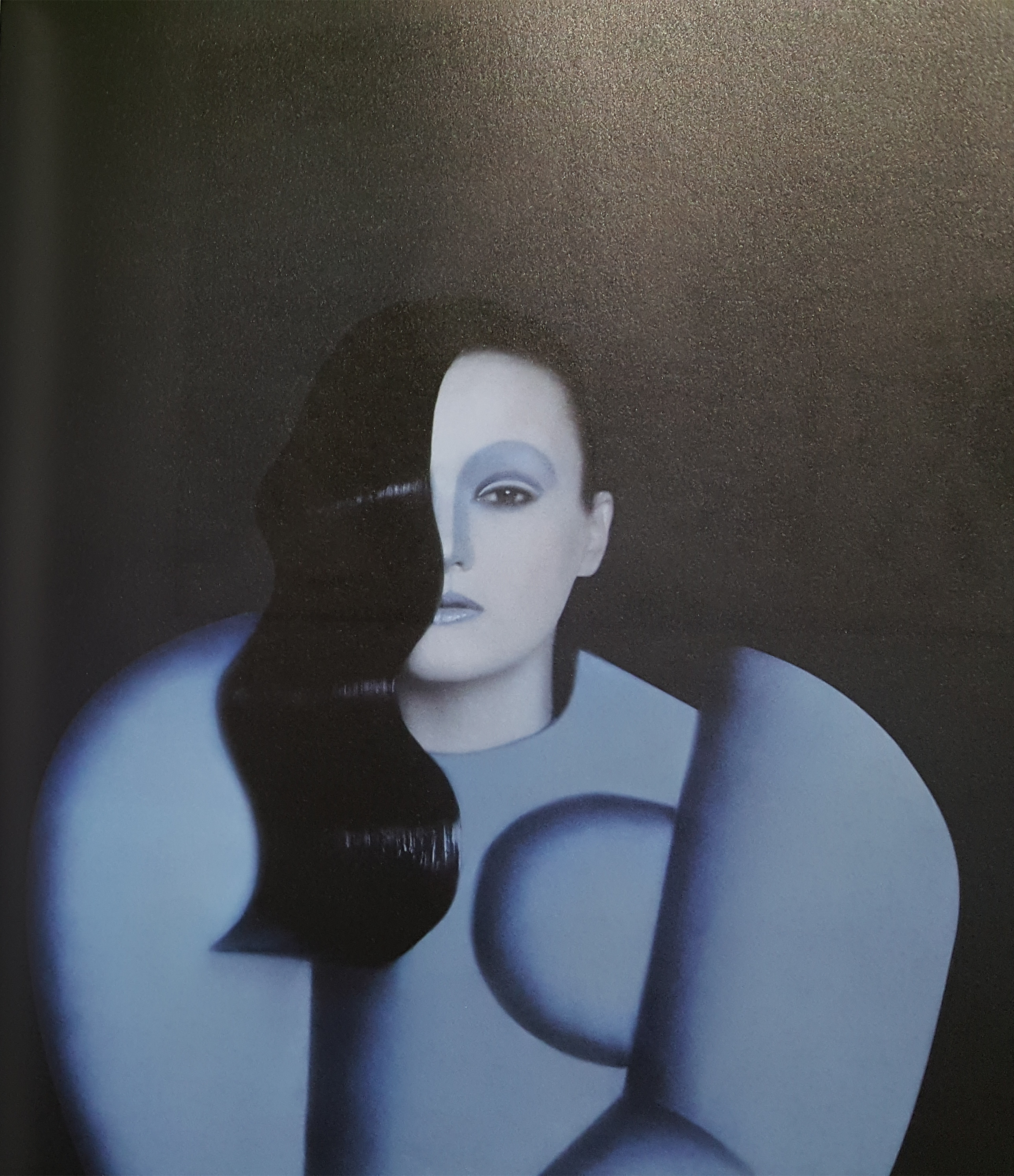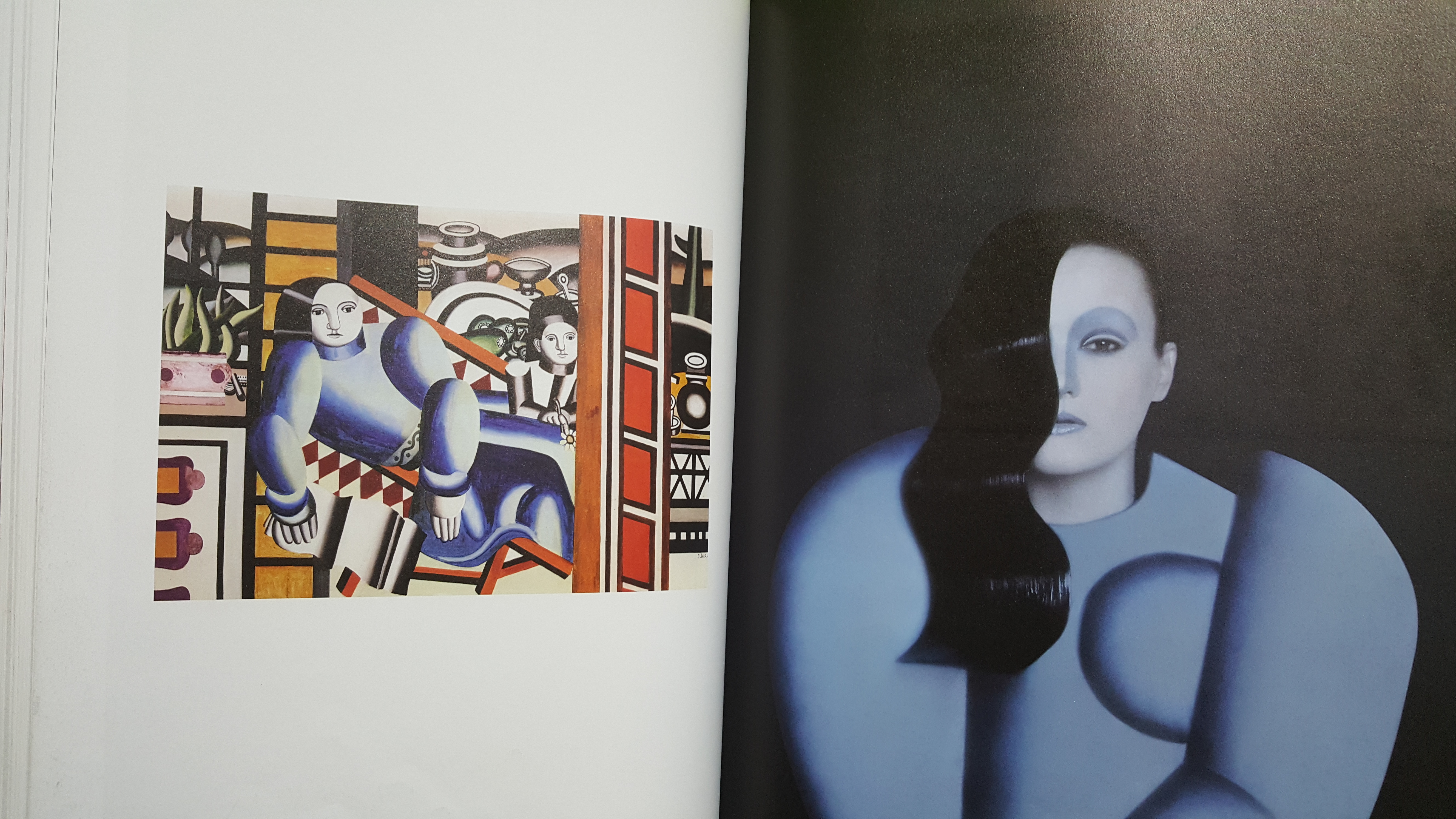 这幅画以纪念碑式的尺寸表现了现代女性形象。她看上去神情漠然,毫无个性,正一动不动地凝视观者。画家将她们表现得仿佛是用铁管、螺钉和铆钉拼合而成,在严整、挺直的矩形背景衬托下,显得僵硬、呆板,有如机器人一般。
