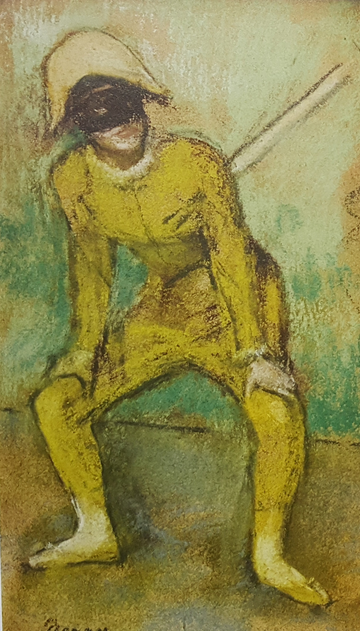 色粉画,是德加艺术的非常重要的标志。上面的作品,就是德加用色粉笔创造性地描绘的人物形象。画中,黄色色粉被他当成一种理想的绘画材料来加以运用。他在画面中,大量采用厚涂的方法进行效果渲染,并因此取得了辉煌的画面效果。可以毫不夸张地说,色粉画艺术的魅力正因为他的色粉画杰作,被人们所认识和真正认可。