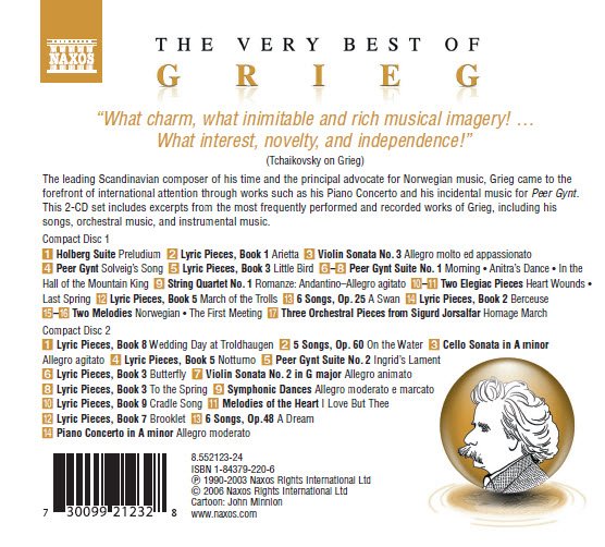 : 01. Holberg Suite, Op. 40: I. Preludium 02. Lyrics Pieces, Book 1, Op. 12: No. 1 Arietta 03. Violin Sonata No. 3 in C minor, Op. 45: I. Allegro molto ed appassionato 04. Peer Gynt, Op. 23, Act IV: Solveig's Song 05. Lyric Pieces, Book 3, Op. 43: No. 4. Little Bird (Voglein) 06. Peer Gynt Suite No. 1, Op. 46 (excerpts): I. Morning 07. Peer Gynt Suite No. 1, Op. 46 (excerpts): III. Anitra's Dance 08. Peer Gynt Suite No. 1, Op. 46 (excerpts): IV. In the Hall of the Mountain King 09. String Quartet No. 1 in G minor, Op. 27: II. Romanze: Andantino - Allegro agitato 10. Two Elegiac Pieces, Op. 34: No. 1. Heart Wounds (Hjertesar) 11. Two Elegiac Pieces, Op. 34: No. 2. Last Spring (Varen) 12. Lyric Pieces, Book 5, Op. 54: No. 3. March of the Trolls (Trolltog) 13. 6 Poems, Op. 25: No. 2. En svane (A Swan) 14. Lyric Pieces, Book 2, Op. 38: No. 1. Berceuse (arr. for violin and piano) 15. Two Melodies, Op. 53: No. 1 Norwegian 16. Two Melodies, Op. 53: No. 2 The First Meeting 17. Three Orchestral Pieces From Sigurd Jorsalfar, Op. 56: III. Homage March 18. Lyric Pieces, Book 8, Op. 65. No. 6. Wedding Day at Troldhaugen (arr. for orchestra) 19. 5 Songs, Op. 60: No. 3. On the Water (Mens jeg venter) 20. Cello Sonata in A minor, Op. 36: I. Allegro agitato 21. Lyric Suite, Op. 54: III. Nocturne 22. Peer Gynt Suite No. 2, Op. 55: I. Ingrid's Lament 23. Lyric Pieces, Book 3, Op. 43: No. 1. Schmetterling (Butterfly) 24. Violin Sonata No. 2 in G major, Op. 13: III. Allegro animato 25. Lyric Pieces, Book 3, Op. 43: No. 6. To the Spring 26. Symphonic Dances, Op. 64: No. 1. Allegro moderato e marcato 27. Lyric Pieces, Book 9: Cradle Song 28. Melodies of the Heart, Op. 5: No. 3. I Love but Thee (arr. for violin and orchestra) 29. Lyric Pieces, Book 7, Op. 62: No. 4. Brooklet (Baekken) 30. 6 Songs, Op. 48: No. 6. A Dream 31. Piano Concerto in A minor, Op. 16: I. Allegro moderato total playing time is 02:18:18.