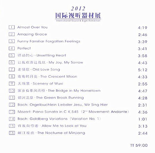 : 01. Almost Over You 02. Amazing Grace 03. Funny Familiar Forgotten Feelings 04. Perfect 05. 驿动的心 06. 让我欢喜让我忧 07. 老情歌 08. 弯弯的月亮 09. 无锡景 10. 家乡有条风雨桥 11. 碧涧流泉 12. Bach: Orgelbuchlein Liebster jesu, Wir Sing Hier 13. Mozart: Piono Sonata in C K.545 (2nd Movement: Andante) 14. Bach: Goldberg Variations (Variation No:1) 15. 许我向你看 16. 岷江夜曲