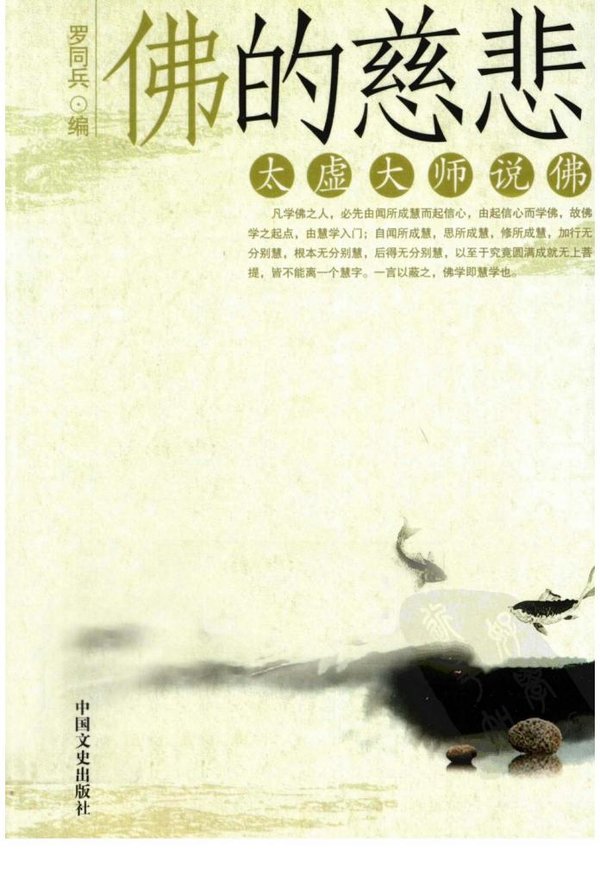 深刻的定慧经验,是大师对人生佛教思想充满自信的基础。他曾庄严地宣布:“吾既直印正等觉于佛心,出为人天眼目”。本此澈悟的智慧,太虚大师的佛教思想广大圆融、平实中正。在他看来,佛教的一切法流宗派的起源都出于释尊菩提场中之智证,所以大师所弘扬的,是探本于佛的行果、境智、依正、主伴而重重无尽的一切佛法;而其要点,则为阐明佛教发达人生的理论,推行佛教利益人生的事业。   罗同兵所编的《佛的慈悲:太虚大师说佛》一书,尽量以简单、亲切的方式,体现大师思想的宗旨,将大师思想的精华,贡献于当代人的面前。