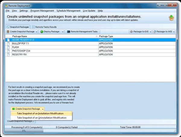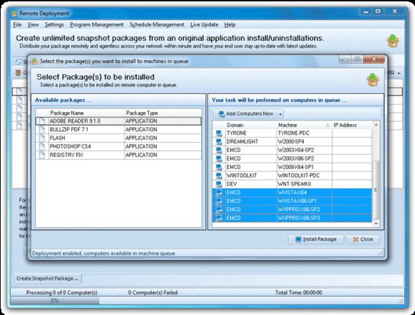 With EMCO Remote Deployment the process of remote software installation is extremely easy and consists of just two steps: deployment package creation and its remote installation. If you have original installation or uninstallation to be replicated on remote PCs, the first step can be fully automatic. You only need to press the button in EMCO Remote Deployment and make a system snapshot to capture current state of file system, registry and services. Then you can follow installation or uninstallation procedure and as soon as it will be completed you need to make another system snapshot. Comparing information from two snapshots application can automatically detect changes and generate deployment package. Finally, when package is ready, you can scan network to detect available PCs and select those where you plan to install package. Remote deployment process is executed in parallel on multiple PCs and works invisible for remote users. Remote Software Deployment Any installation or uninstallation process, executed locally, can be replicated to one or multiple remote PCs to perform mass remote software installation or uninstallation. No client modules installation or special remote PCs configuration is required. Unattended software installation and uninstallation Mass application deployment to remote PCs Silent deployment process on remote side Automatic Deployment Package Generation Deployment package is automatically prepared by taking two OS snapshots: before and after running application installation or uninstallation procedures. Detected file system, registry and other changes are included into the package. Package generation for any installation and uninstallation Fast snapshoting process that takes less than 1 minute Snapshoting of processes that require system reboot Remote Deployment Services Automated deployment gives you an ability to remotely install software to any node in your network, located in domain or workgroup. You only need to have an administrative access to remote PC in order to make remote installation. Schedule deployment by adding task to Windows schedule Execution of defined process before and after deployment E-mail notifications upon remote installation completion Deployment Package Settings Deployment package includes set of file system, registry and services changes that can be replicated to remote PCs. It is environment-independent, so you can deploy it to computers with different OS and system settings. Using system variables instead of platform-specific paths Automatic filtering of configured resources modification Starting and stopping services in scope of installation EMCO Remote Deployment System Requirements Computer running EMCO Remote Deployment must meet following requirements. Minimum Hardware Requirements 1 GHz Intel Pentium processor or equivalent 512MB of RAM 250MB of free disk space Recommended Hardware Requirements 2 GHz Intel Pentium processor or equivalent 1GB of RAM 500MB of free disk space Supported Platforms Windows 2000 (with SP4 or later), Windows XP, Windows XP x64, Windows 2003, Windows 2003 x64, Windows Vista, Windows Vista x64, Windows 2008, Windows 2008 x64, Windows 2008 R2, Windows 7, Windows 7 x64 Requirements Administrative rights on the local computer Enabled NetBIOS over TCP/IP Requirements for Remote Computers Remote computers, accessed by EMCO Remote Deployment must meet following requirements. Platform: Windows 2000 (with SP4 or later), Windows XP, Windows XP x64, Windows 2003, Windows 2003 x64, Windows Vista, Windows Vista x64, Windows 2008, Windows 2008 x64, Windows 2008 R2, Windows 7, Windows 7 x64 An access with a Local or Domain administrator rights Enabled NetBIOS over TCP/IP Enabled File and Printer sharing Enabled access to the ADMIN$ share An ability to ping the computer within 1500 ms Started services: Computer Browser, Remote Registry TCP ports opened: 135, 139, 445, 6245 UDP ports opened: 137, 138 代码 Ü ÜÜÛß Ü LineZer0! Ü²Ü ß ÜÜ Ü²Ü Þ²ÜÜ Ü Üܲ²²ÛÝ ²Ý Ü ßÜÜ Ü ß ÜÛ²Ü ß²²Ü ß Üܲßß Ü²± ß±²²ÛÛÛÜ ß Ü Þ²Ý ÛÝ ßßÜ Þ²²²²ßß Üܲ²Û²Ý Þ²ÛÛÛÛÛß ²Ý ÜÜ²ß ßÜÜ Ü²Ü Þ²ÜÜÛßß ÜܲÛÛÛßÛÛÛ² ²ÛÛÛÛÝ ²²ÛÜßßÜß Ü²ÛÜ Þ²Ý ß Ü²²² ÜܲÛÛÛßß ÛÛÛ² ²ÛÛÛ² ß²²Ý ²Ý ßß Ü²²ÜÛßßßßß² ß²²ÛÛÜ Þ²Ý ÛÛÛ²Ü Þ²ÛÛÛÝ Ü ß²Ü²²Ü ÜÜܲßßß Üܲ²²Ü ßÜ ²ÜÛÛ² ±²Ü ßÛÛ²²±ÜÜ Þ²ÛÛÛÝ ²ÛÛÜÜ ßßßßß ÜÜܲÛÛÛÛÛÛÛ²²Ü ÞÝÞÛÛÝÞ²²²Ü ÞÛÛÛ²²± Ü²Ü ±²ÛÛÛ ²ÛÛÛÛÛÛÛÛ ²²ÛÛÛßßß ßÛßÛÛ²²ÜÞÝÞÛÛÝÞ²²±ß ÜÛÛÛÛÛ± Ü²Ü Ü ß ²ÛÛÛÛ Þ²ÛÛß°ß²ß Ü Þ²ÛÛÛÝ Þ²Û ÞÝÞÛÛ²²²Û ÛÛ² ±ß ÜÛß ²ÛÛÛ² ß Ü ²Ü Þ²ÛÛÛÝ ²²ÛÛ ÞÝ ÞÝ ßßßßß Ü²ß ÜßÜÛÛ²²ß Û ÛÛ² ÜÛß ÞÛÛÛ²Ý Ü² Ü Þ²ÝÞ²ÛÛÛÝ ß²ÛÛÜßÜ ßÛ²²²²ßß ÜÜÛÜÛ²ßß ÜÝ Û ÛÛ²ÛÛß Ü² ÞÛÛÛ²ÝÞ²Ý Ü ²²ß ²²ÛÛ² ÞÜ ß²ÛÛÜßÜ ßß ÜܲÛÛÛßßÜÜÜÜÜÜ Ü²ßÛÛÛÛÝ ²²²Ý ²ÛÛ²± ß²² ß Ü Þ²ÝÞ²ÛÛÛ² ²ßß ÜÛÛÛÛ۲ܲ²ÛÛÛÛÛÛÛÛÛÛÛÛÛÛÛÛÜÛßÛÛÛÛÜ ßßÝ ²ÛÛÛ²ÝÞ²Ý Ü ß cpNÞ²²² ±²ÛÛÛÝ ÜÜÜÛÛÛÛÛÛÛÛ²²±±²²ßßßßßßßßß²²²ÛÛÛÛܰܲÛÛÛÛÛÜÜÜ ÞÛÛÛ²± ²²²ÝcRo Üܲ²ß ±²²ÛÛÛÛÛÛÛÛ²²²ßßßß ÜÜܲ²Û²ÛÜÜÜ ßß²²ÛÛÛÜßß²²²ÛÛÛÛÛÛÛÛ²²± ß²²ÜÜ ß²²²² ܱ±²²²ÛÛ²²ßßß ÜÜÜÜß Ü²ßß ßß²²Ü ß²²ÛÛÝ ßßß²²ÛÛ²²²±±Ü ²²²²ß ÞÛÛ²ÜÜÜ ßß²²ß ÜÜܲ²ÛÛÛ²² ²²Ý presents Þ²ÛÝ Þ²ÛÛݱ²²ÜÜÜ ß²²ßß ÜÜܲÛÛÝ Ü۲߲ÛÛßßß Ü²Ü ß²²Ü ßßß Ü²ÛÛß Ü²Ü ßßßÛ۲߲ÛÜ ²²ÛÝ ²²± Ü²Ü ß ßßßÛÜÜÜÜÜÜÜÜÜÜÛ²ßßß ß Ü²Ü ±²² ÞÛ²² ß²²ÛÜ °° Ü ß ß Ü °° ÜÛ²²ß ß²Û
