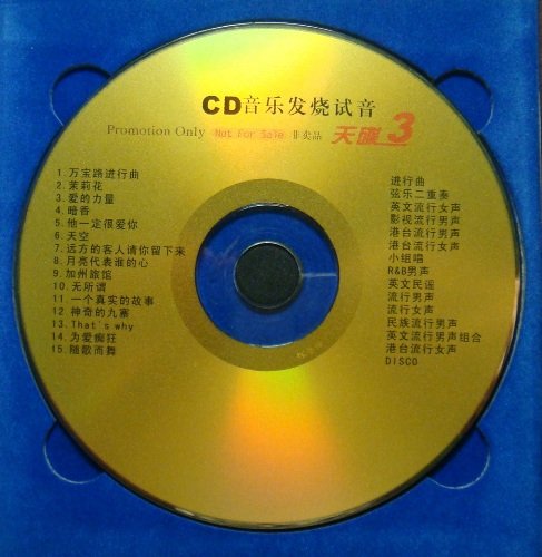 2004年买音响时送的一盘CD,上书“非卖品”,里面15首都是经典老歌,自己听了很长时间了,效果不错,给大家分享。做好文件后,Goldwave看了看频谱,和VC高手描述的APE形态符合,这才发上来,第一次发音乐资源,不对之处请指正。