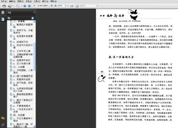 人生路上既有利弊成败,也有祸福得失,在成败中不断磨砺自己,完善自己,在得失中不断完善自己,更新自己,在得与失之间无须徘徊,更不必苦苦挣扎,以平常心来对待成败和得失,知道什么是最重要的,放弃那些可有可无的,从而选择我们生命中最有价值、最珍贵的东西,本书从做人、做事、心态、处事、职场、官场、商场、情场这八个方面来讲解人生哲学中的选择与放弃。
