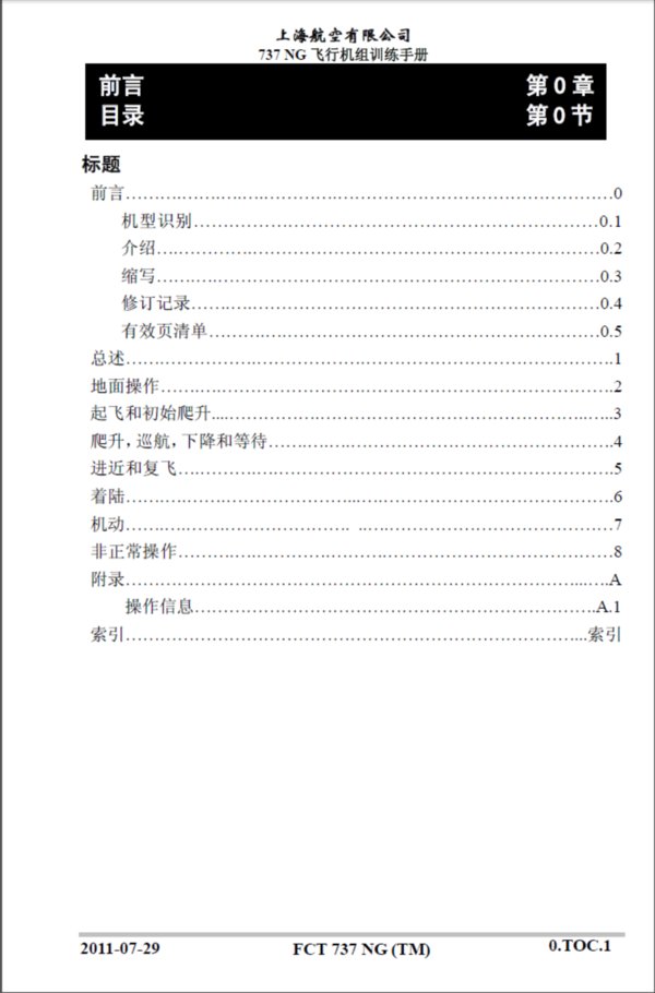 : 前言 机型识别 介绍 缩写 修订记录 有效页清单 总述 地面操作 起飞和初始爬升 爬升,巡航,下降和等待 进近和复飞 着陆 机动 非正常操作 附录 操作信息 索引