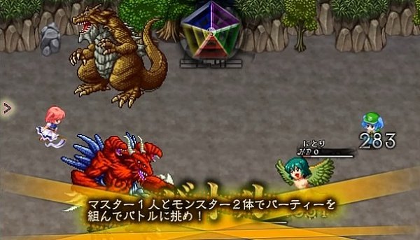 战斗系统类似口袋妖怪:一个人带6只怪物 同时能召唤出2只 召唤者+2只怪物进行3vs3的战斗。怪物可以帮召唤者抵挡攻击 怪物战死了可以再召唤出替补 最后把对方召唤者打死就赢了