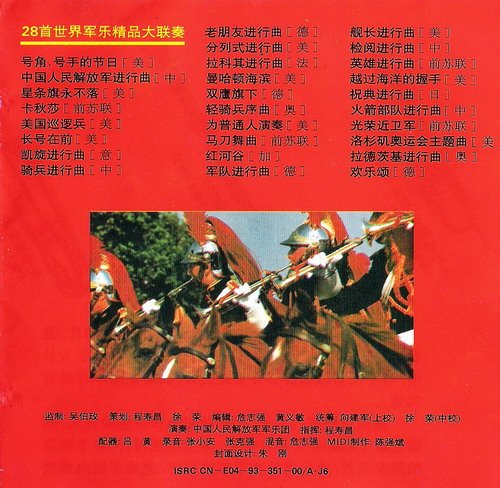 : 01 序曲:号角.号手的节日 [美] 02 中国人民解放军进行曲 [中] 03 星条旗用不落 [美] 04 卡秋莎 [俄] 05 美国巡逻兵 [美] 06 长号在前 [美] 07 凯旋进行曲 [意] 08 骑兵进行曲 [中] 09 旧友进行曲 [德] 10 分列式进行曲 [美] 11 拉科奇进行曲 [法] 12 曼哈顿海滨 [美] 13 双鹰旗下 [德] 14 轻骑兵序曲 [奥] 15 为普通人演奏 [美] 16 马刀舞曲 [俄] 17 红河谷 [加] 18 军队进行曲 [德] 19 舰长进行曲 [美] 20 检阅进行曲 [中] 21 英雄进行曲 [俄] 22 跃过海洋的握手 [美] 23 祝典进行曲 [日] 24 火箭部队进行曲 [中] 25 光荣近卫军 [俄] 26 洛杉矶奥运会主题曲 [美] 27 拉德茨基进行曲 [奥] 28 终曲:欢乐颂 [德] 全曲: 53:33