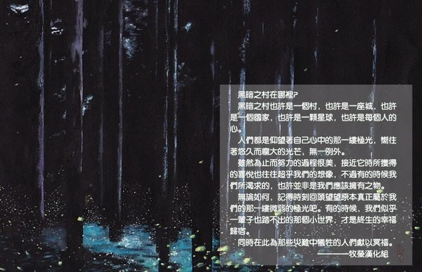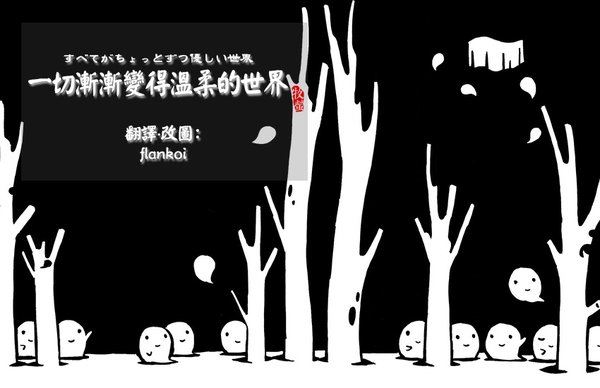 【作品信息】 ■漫画名: 一切漸漸變得溫柔的世界 ■漫画原名:すべてがちょっとずつ優しい世界 ■作者名:西島大介 ■出版社名:講談社 ■发行日期:2012/11/21 ■汉化日期:2013/01/19 ■文字: 简体中文 ■图片数/版型228P 21cm ■分辨率: 1500x1200 【作品介绍】 被寂静与黑暗支配的小小岛上的小小村落。这个名为「黑暗之村」的村子里,夜晚永不终结,收成甚少。每年一度的祭典中甚至没有乐器。就在这被世界遗忘的村子,有一天,城里人造访了这个。提出要在这里种植能够带来光明的「光之树」。即使面对无从言语的事物,人们仍然选择了将手伸出…。 【汉化信息】 翻译:flankoi 改图:flankoi 黑暗之村在哪里?  黑暗之村也许是一个村,也许是一座城,也许是一个国家,也许是一颗星球,也许是每个人的心。  人们都是仰望著自己心中的那一缕极光,嚮往著悠久而庞大的光芒,无一例外。  虽然为之而努力的过程很美,接近它时所获得的喜悦也往往超乎我们的想像,不过有的时候我们所渴求的,也许并非是我们应该拥有之物。  无论如何,记得时刻回头望望原本真正属於我们的那一缕微弱的极光吧。有的时候,我们似乎一辈子也踏不出的那个小世界,才是终生的幸福归宿。  同时在此为那些灾难中牺牲的人们献以冥福。                   ——牧萤汉化组