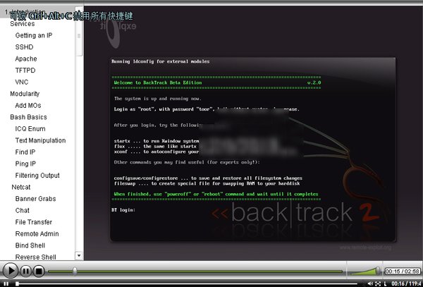 本视频是Offensive Security推出的,主要是如何使用Backtrack系统来进行入侵监测。