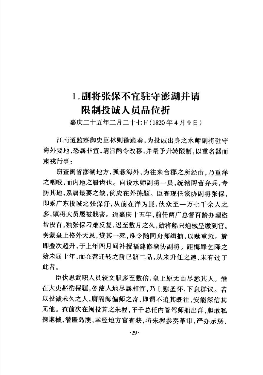 1.副将张保不宜驻守澎湖并请限制投诚人员品位折