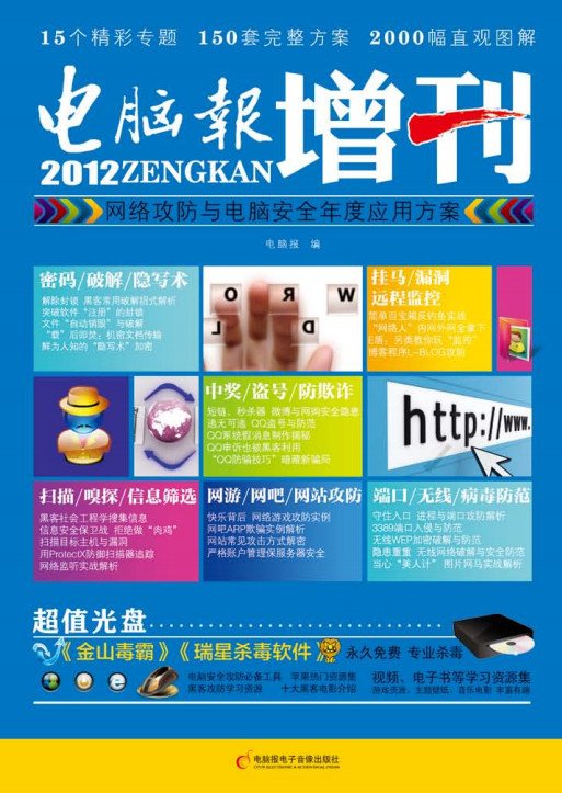 : 电脑与数码是当今人们生活与科技应用的两大主题,选用电脑、时尚数码、玩转网络、摄影影音、平板手机、防黑安全、品质生活……如果你不想OUT于主流社会的科技潮,如果你想利用科技产品全面提升工作学习效率,提高生活品质,掌握热门的电脑与数码应用方案,精通各种使用技巧,那是必须的!纵然有海阔天空的网络资源,即使有高手朋友帮你解决难题,不如打开这套《2012电脑报增刊》,方案握在手,排困不求人。 精选15大热门黑客攻防专题,包含200多个热点应用方案,1000余条攻防技巧,为大家解析黑客的各种攻防技术和攻防手段,并介绍行之有效的防范措施。具体内容包括:微博与网购安全隐患、QQ盗号与防范、扫描与嗅探、端口与进程攻防、加密与突破、网络钓鱼与网页挂马、网络游戏攻防、网吧入侵与防范、图片病毒攻防、无线网络攻防、网站与服务器攻防等。