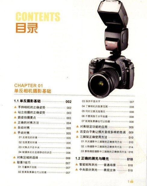 : 第一章 单反相机摄影基础 1.1 单反摄影基础 1.2 正确的测光与曝光 1.3 其他设置与摄影模式 第二章 拍出好照片的技巧 2.1 恰当安排摄影画面构成 2.2 多种手段突出画面主体 2.3 将各种构图形式运用到摄影中 2.4 用色调实现构图 2.5 摄影光线的把握 第三章 人像摄影基础 3.1人像摄影器材的应用 3.2人像构图技巧 3.3 模特姿势摆设技巧 3.4 模特姿势示范 3.5 人像摄影用光技巧 第四章 人像摄影实战技巧 4.1 户外美女拍摄技巧 4.2 利用街景拍人像 4.3 拍好展会中的模特 第五章 风景摄影实战技巧 5.1 山水美景摄影实例 5.2 草原与花草树木摄影实例 5.3 晨昏与夜景摄影实例 5.4 其他风景摄影实例 第六章 网店商品摄影实战技巧 6.1 电子与器皿产品摄影技巧 6.2 鞋类与饰品摄影技巧