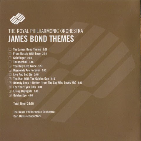 The Royal Philharmonic Orchestra treads where many others have gone before by recording an album of themes from the James Bond movies. In the hands of conductor Carl Davis and arranger Nic Raine, the 12 themes are, for the most part, given subtler, more romantic interpretations than usual. This is not true of the leadoff track, Monty Norman's "The James Bond Theme," which actually is taken at a slightly faster tempo than is typical. But "Goldfinger" is slower and more majestic than the well-known hit recording by Shirley Bassey. Although an electric guitar takes the melody line for much of "Live and Let Die," the Paul McCartney-composed theme is robbed of much of its power by Davis and Raine's approach, but, for example, Bill Conti's "For Your Eyes Only," with its slow, solemn melody, is perfectly suited to it. The conductor and arranger might have been better advised to try different styles appropriate to different themes, but they have created a consistent musical package of music originally written by a large number of composers. Still, there are better albums of these themes.