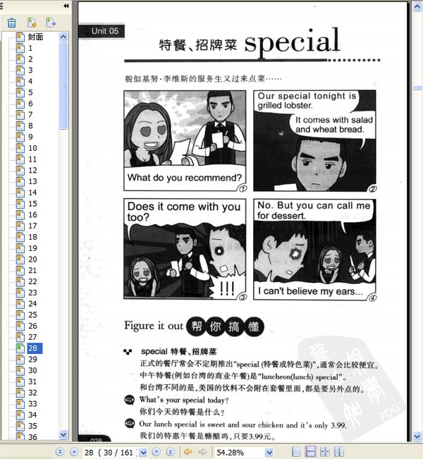 : Unit 01.thrilled to bits 超兴奋 麻花突然邀派德到“红龙虾”吃饭,惊喜的派德紧急找唯一的男性好友泰瑞商量…… Unit 02.eat out 在外吃饭 麻花稍微打扮了一下,在客厅等着派德来接她去餐厅 Unit 03 预先订位 麻花和派德在前往餐厅的路上 Unit 04 全神倾听 派德终于如愿以偿地和麻花共度第一次晚餐…… Unit 05 特餐、招牌菜 貌似基努·李维斯的服务生又过来点菜…… Unit 06 取代 服务生继续帮两人点菜…… Unit 07 同样的再来一份 服务生最后问麻花和派德是否要点饮料 Unit 08 插嘴 用餐的时候,派德着找话题和麻花聊天 Unit 09 打包袋 两人吃完,麻花叫服务生准备结账 Unit 10 忍受、容忍 服务生把账单送到,麻花仍不忘向他放电 Unit 11 万人迷 关于“红龙虾帅哥”的二三事 Unit 12 怪胎、怪人 关于“胡混派德”的二三事 Unit 13 搭讪、放电 安琪拉向派德探问与麻花晚餐的结果…… Unit 14 身体不适 沙基路过客厅,看到爷爷一脸发红地躺在沙发上…… Unit 15 看得比吃得多 麻花一家到高级的欧式自助餐厅用餐 Unit 16 大吃大喝 麻花一家继续在自助餐厅里快乐的吃吃喝喝 Unti 17 渺茫不可及之事 麻花向安琪拉炫耀自己在餐厅遇见帅哥的事 Unit 18 伤某人的心 两人继续闲聊,安琪拉抱怨麻花让派德伤心 Unit 19 注定要 Unit 20 恶作剧 Unit 21 巧遇 Unit 22 内用或外带 Unit 23 扫兴的人 Unit 24 下大雨 Unit 25 挣钱讨生活 Unit 26 为某人加油 Unit 27 薄皮还是厚皮 Unit 28 说曹操,曹操到。 Unit 29 随时看着 Unit 30 冷静 Unit 31 易如反掌 Unit 32 当季的 Unit 33 退货 Unit 34 过期无效 Unit 35 合口味、对味的 Unit 36 严格对待 附录