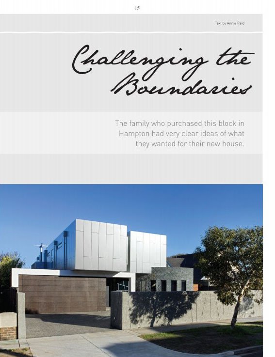 : 8 sculptured river vista 14 challeng ing the boundaries 20 everthing old is new again 24 urban chameleon 28 top end of town 32 a minimalist masterpiece 36 responding to the landscape 40 a private affair 44 sleek & refined 48 part of the streetscape 52 designed to last 56 once in a lifetime 62 building for architects 66 a lecel of luxury 70 waterfront living 74 sea of tranquility 80 the taking of st.paul's 84 energy efficient 88 modern narrow space 92 the house that jack built 96 beyond the first lmpression 102 spiritual revival 106 the bold and the brash 110 looking for a change 114 the shape of things to come 118 curves and textures 122 sculptured vision 124 sustainable country house 130 holly wood dreaming 136 cutting edge design 142 the art of living 148 flamboyant vistas 154 cutting edge 160 texturde elegance 166 integrated design 172 rural sophistication 178 design savvy modena 182 modern asian flavour 186 a custom fit 188 outside the box 194 just add water 198 private resort 206 aesthetically smooth 208 aesthetically smooth 214 born again 218 a coastal response 222 home work 226 french provincial 232 textured space 236 maximum coverage 240 winning approval 246 minimalism meets nature... 250 melding the old with the new 254 wind swept 260 space conscience 266 think brick 270 on a clear day 276 bricks in good form 280 a good view