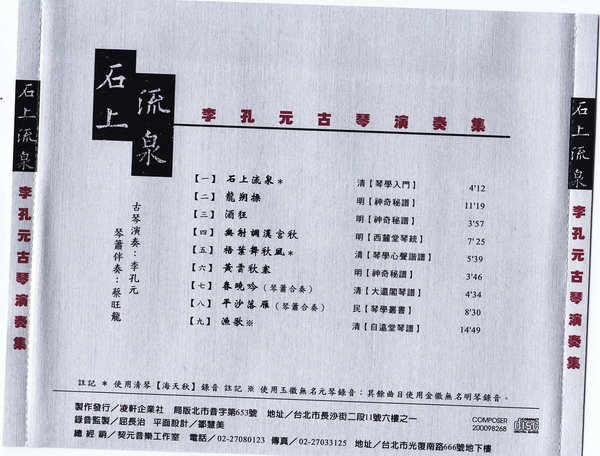 2000年出版CD《石上流泉——李孔元先生古琴演奏集》。