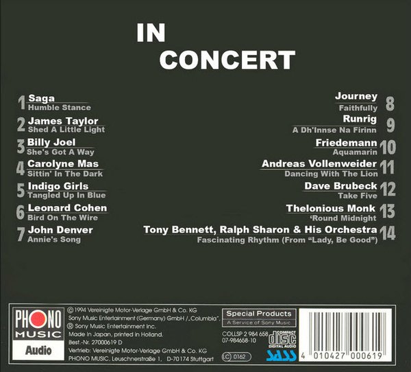 : 01. Saga / Humble Stance 06:12 02. James Taylor / Shed A Little Light 04:08 03. Billy Joel / She's Got A Way 03:04 04. Carolyne Mas / Sittin' In The Dark 13:35 05. Indigo Girls / Tangled Up In Blue 07:56 06. Leonard Cohen / Bird On The Wire 06:49 07. John Denver / Annie's Song 03:01 08. Journey / Faithfully 04:19 09. Runrig / A Dh'innse Na Firinn 05:32 10. Friedemann / Aquamarin 06:26 11. Andreas Vollenweider / Dancing With The Lion 05:35 12. Dave Brubeck / Take Five 03:35 13. Thelonious Monk / 'Round Midnight 06:34 14. Tony Bennett, Ralph Sharon & His Orchestra / Fascinating Rhythm 01:23