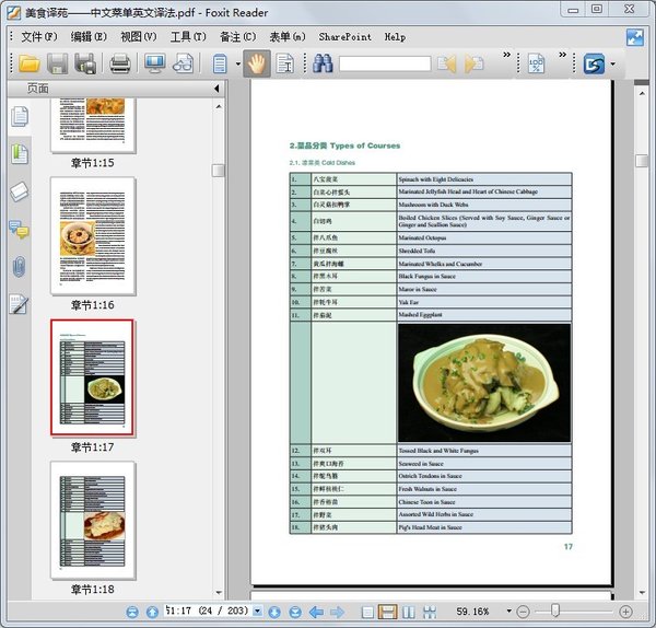 本书共分三章,分别对中餐、西餐、饮品进行了标准的英文翻译,其中中餐部分细化到八大菜系,包括鲁菜、川菜、闽菜等特色饭菜的介绍和重点翻译。