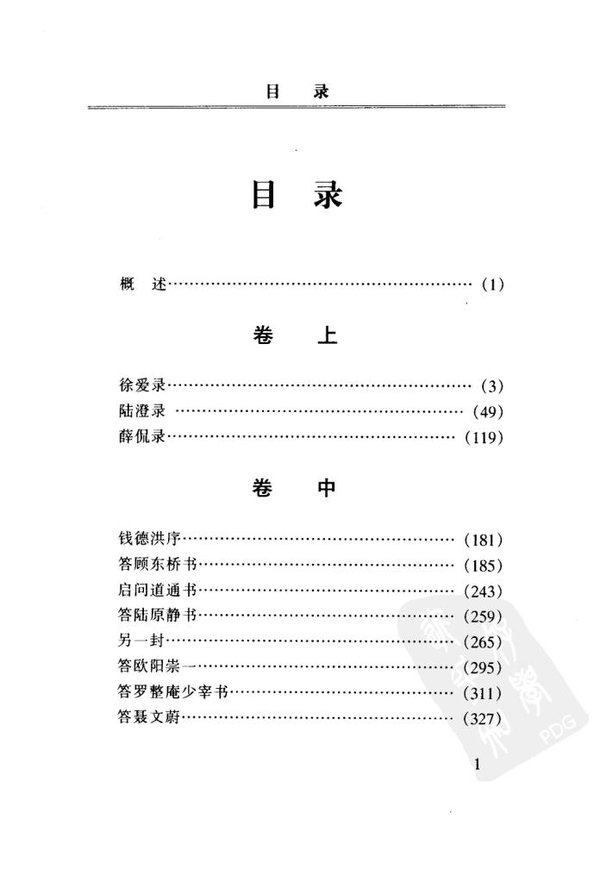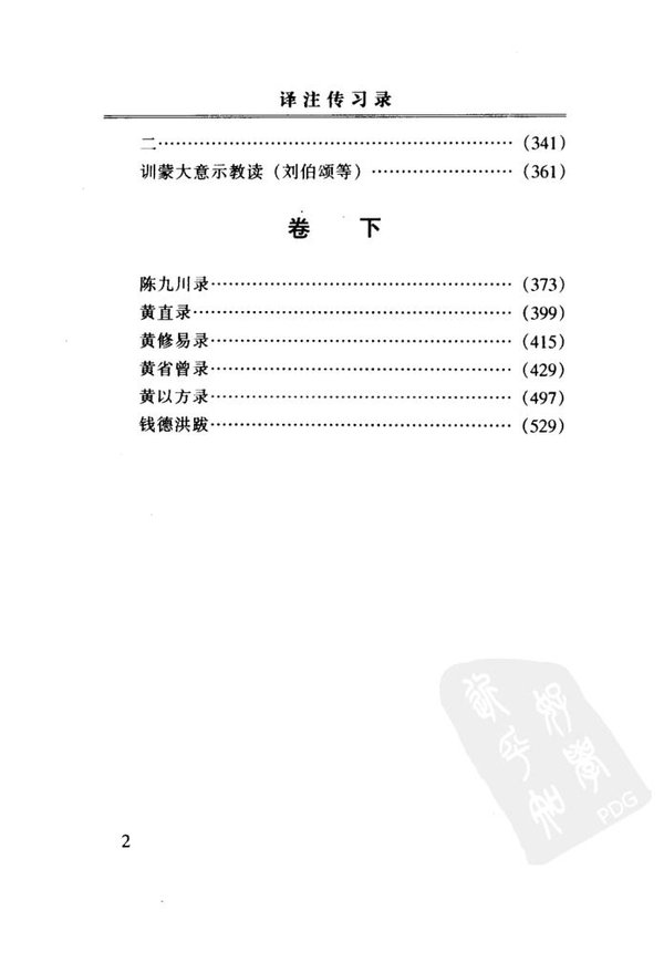 : 前言 上卷 徐爱录 徐爱跋 陆澄录 薛侃录 中卷 钱德洪序 答顾东桥书 答周道通书 答陆原静书(一) 答陆原静书(二) 答欧阳崇一 答罗整庵少宰书 答聂文蔚(一) 答聂文蔚(二) 训蒙大意示教读刘伯颂等 教约 下卷 陈九川录 黄直录 黄修易录 黄省曾录 钱德洪录 钱德洪附记 黄以方录 钱德洪跋