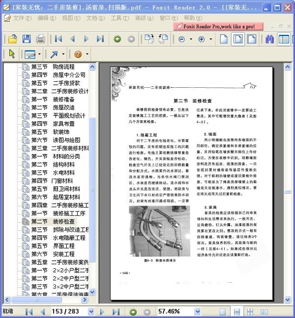 : 前言 第一章 二手房选购指南 第一节 二手房的概念 第二节 楼盘考察 第三节 购房流程 第四节 房屋中介公司 第五节 二手房贷款 第二章 二手房装修设计 第一节 装修准备 第二节 房屋改造 第三节 平面规划设计 第四节 家具布置 第五节 软装饰 第六节 读图与绘图 第三章 二手房装修材料 第一节 材料的分类 第二节 结构材料 第三节 水电材料 第四节 门窗材料 第五节 厨卫间材料 第六节 起居室材料 第四章 二手房装修施工 第一节 装修施工工序 第二节 装修检查 第三节 拆除与改造工程 第四节 水电隐蔽工程 第五节 界面工程 第六节 安装工程 第五章 二手房装修案例 第一节 2×2小户型二手房装修案例 第二节 2×2中户型二手房装修案例 第三节 3×2中户型二手房装修案例 第六章 二手房保洁消毒 第一节 二手房装修的污染源 第二节 装修污染防治 第三节 二手房装修消毒 附录预算报价参照表