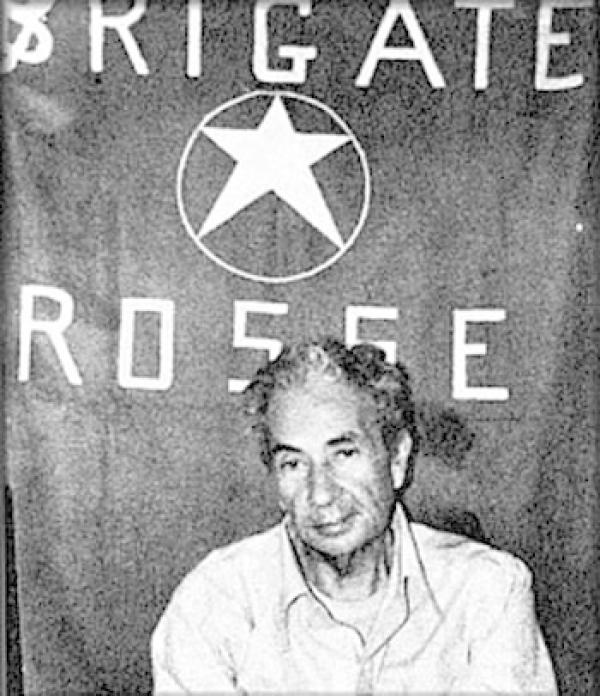 莫罗被绑架后,站在“红色旅”标志前拍摄的一张照片,由“红色旅”发出。