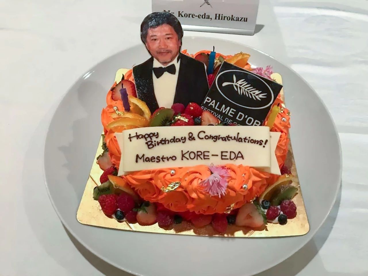 在戛纳的首映礼上,是枝裕和收到的56岁生日蛋糕
